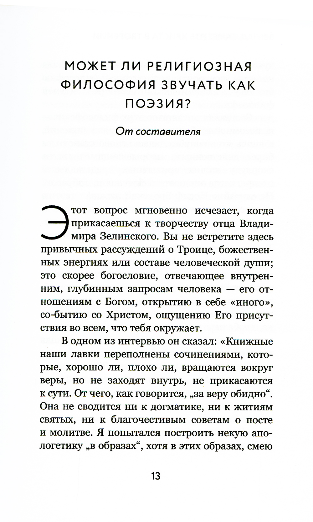 Что такое вера? Не есть ли это открытие в себе взгляда, который преображает всё вокруг, позволяет увидеть мир в абсолютно новом свете, разглядеть во всем окружающем Божественное присутствие? Взгляда, который высекает искру красоты и поэзии из каждого будничного момента, превращая его в Событие Встречи? Настоящая книга - собрание удивительных по красоте, глубине и афористичности размышлений о вере как преображающем жизнь опыте узнавания, авторства протоиерея Владимира Зелинского - современного религиозного писателя, философа, богослова.| Издательство | Изд. НИКЕЯ |