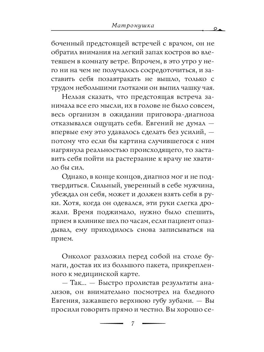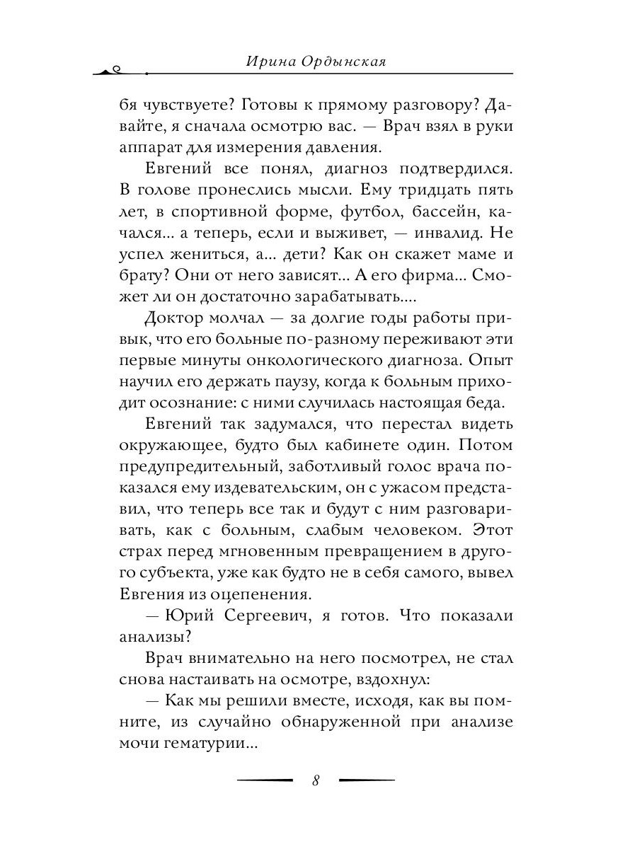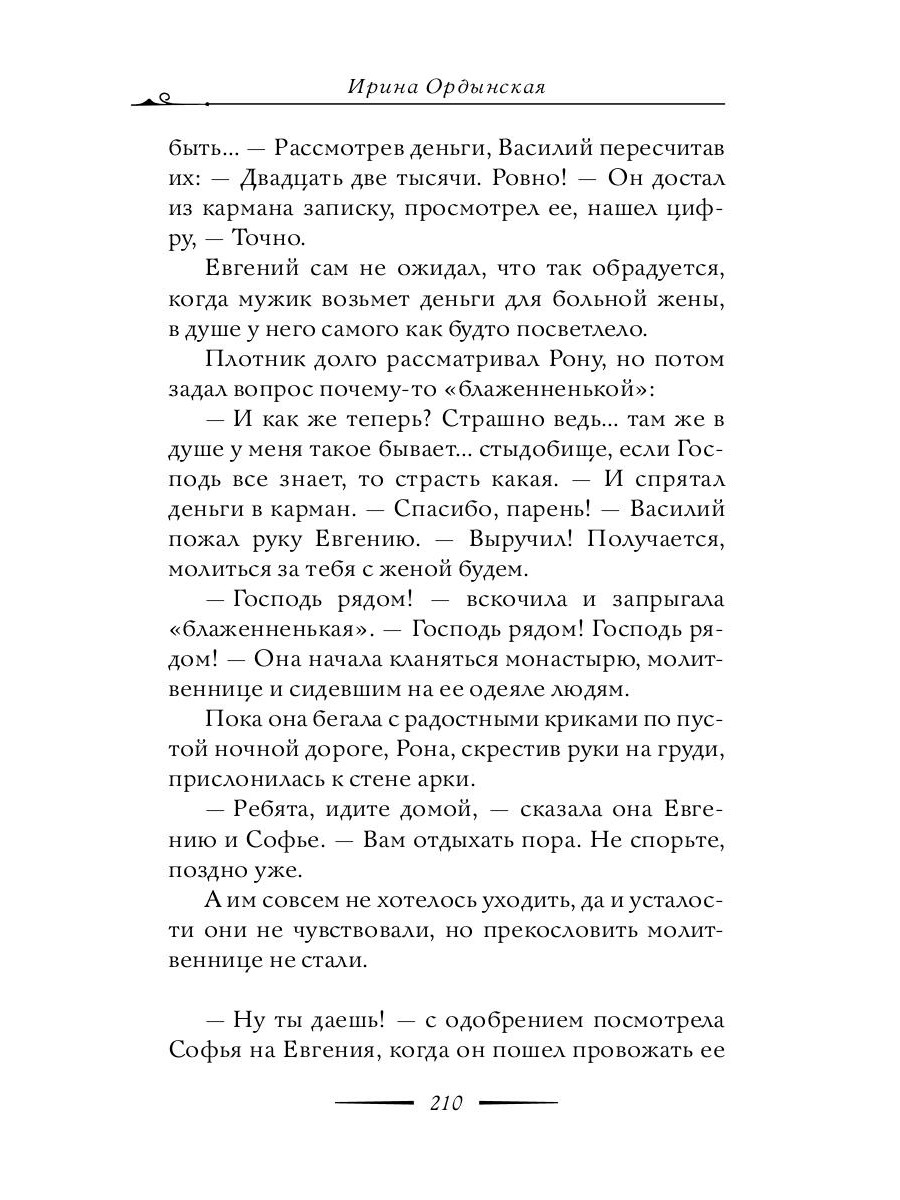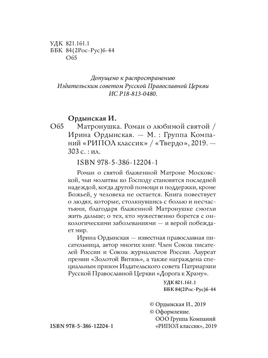 Роман о святой блаженной Матроне Московской, чьи молитвы ко Господу становятся последней надеждой, когда другой помощи и поддержки, кроме Божьей, у человека не остается. Книга повествует о людях, которые, столкнувшись с болью и несчастьями, благодаря блаженной Матронушке смогли жить дальше; о тех, кто мужественно борется с онкологическими заболеваниями - и верой побеждает мир. Ирина Ордынская - известная православная писательница, автор многих книг. Член Союза писателей России и Союза журналистов России. Лауреат премии «Золотой Витязь», а также награждена специальным призом Издательского совета Патриархии Русской Православной Церкви «Дорога к Храму».| Издательство | Рипол Классик |