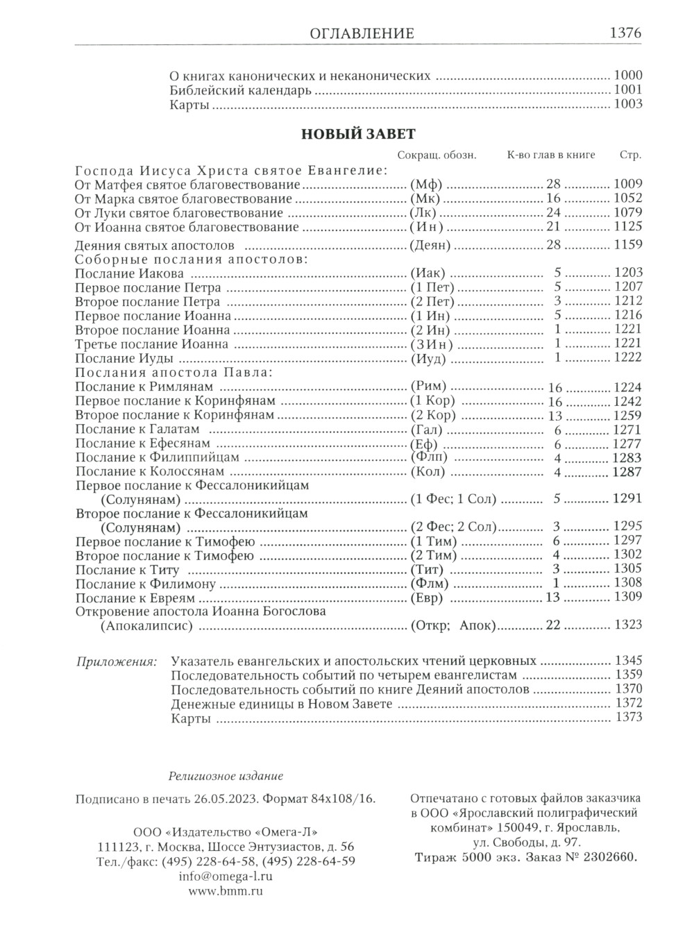 Библия на русском языке в Синодальном переводе с неканоническими книгами. Издание большого формата в твердом переплете с блинтовым тиснением и с тиснением золотой фольгой. Указатели ветхозаветных, евангельских и апостольских церковных чтений. Чёрно-белые географические карты. По благославению Святейшего Патриарха Московского и всея Руси Кирилла, отпечатано по оригиналу-макету, предоставленному Издательским Советом Русской Православной Церкви.| Издательство | Омега-Л |
