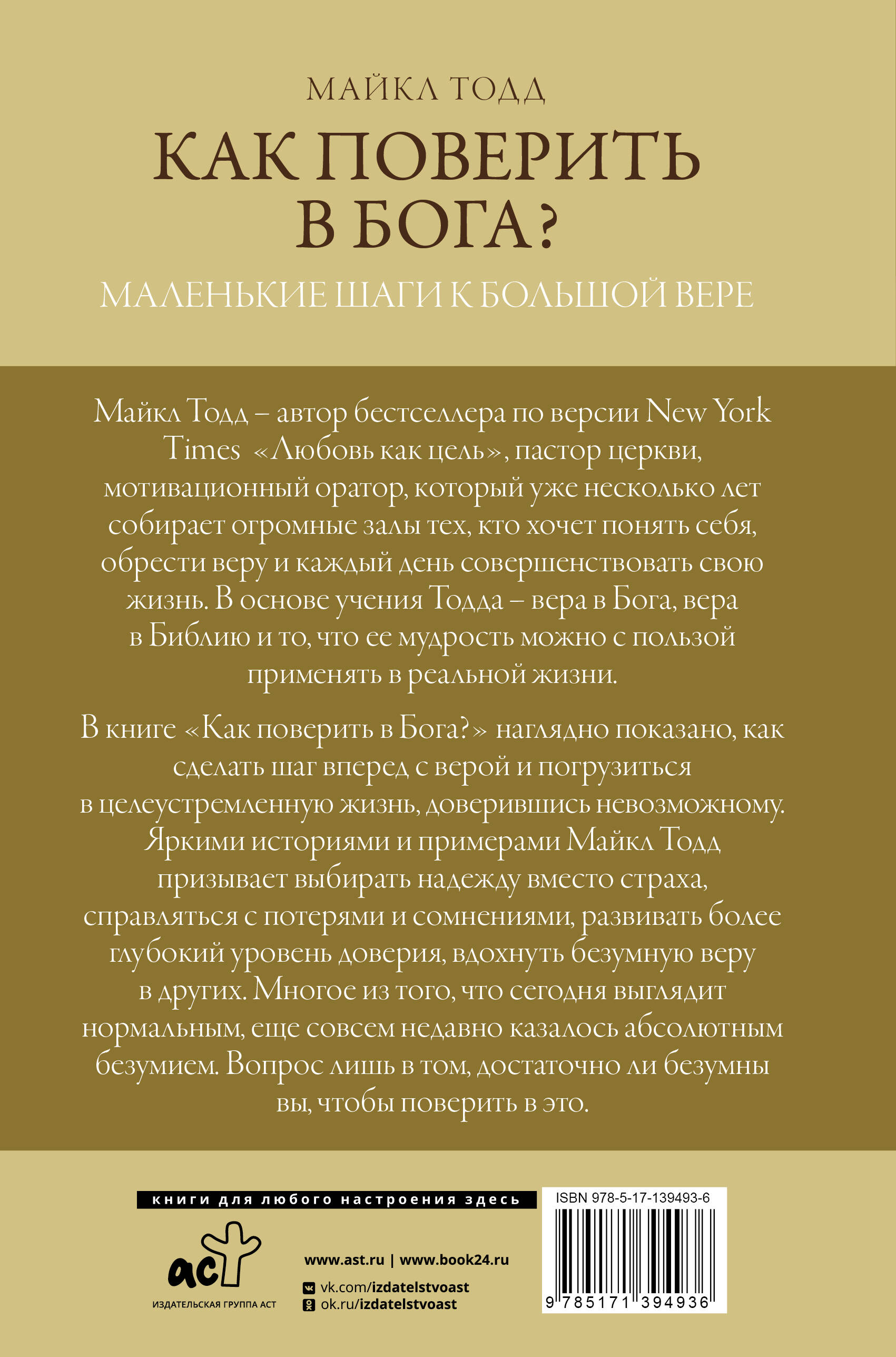 Майкл Тодд - автор бестселлера по версии New York Times "Любовь как цель", пастор церкви, мотивационный оратор, который уже несколько лет собирает огромные залы тех, кто хочет понять себя, обрести веру и каждый день совершенствовать свою жизнь. В основе учения Тодда - вера в Бога, вера в Библию и то, что ее мудрость можно с пользой применять в реальной жизни. В книге "Как поверить в Бога?" наглядно показано, как сделать шаг вперед с верой и погрузиться в целеустремленную жизнь, доверившись невозможному. Яркими историями и примерами Майкл Тодд призывает выбирать надежду вместо страха, справляться с потерями и сомнениями, развивать более глубокий уровень доверия, вдохновлять безумную веру в других. Многое из того, что сегодня выглядит нормальным, еще совсем недавно казалось абсолютным безумием. Вопрос лишь в том, достаточно ли безумен вы, чтобы поверить в это.| Издательство | ИЗДАТЕЛЬСТВО "АСТ" |