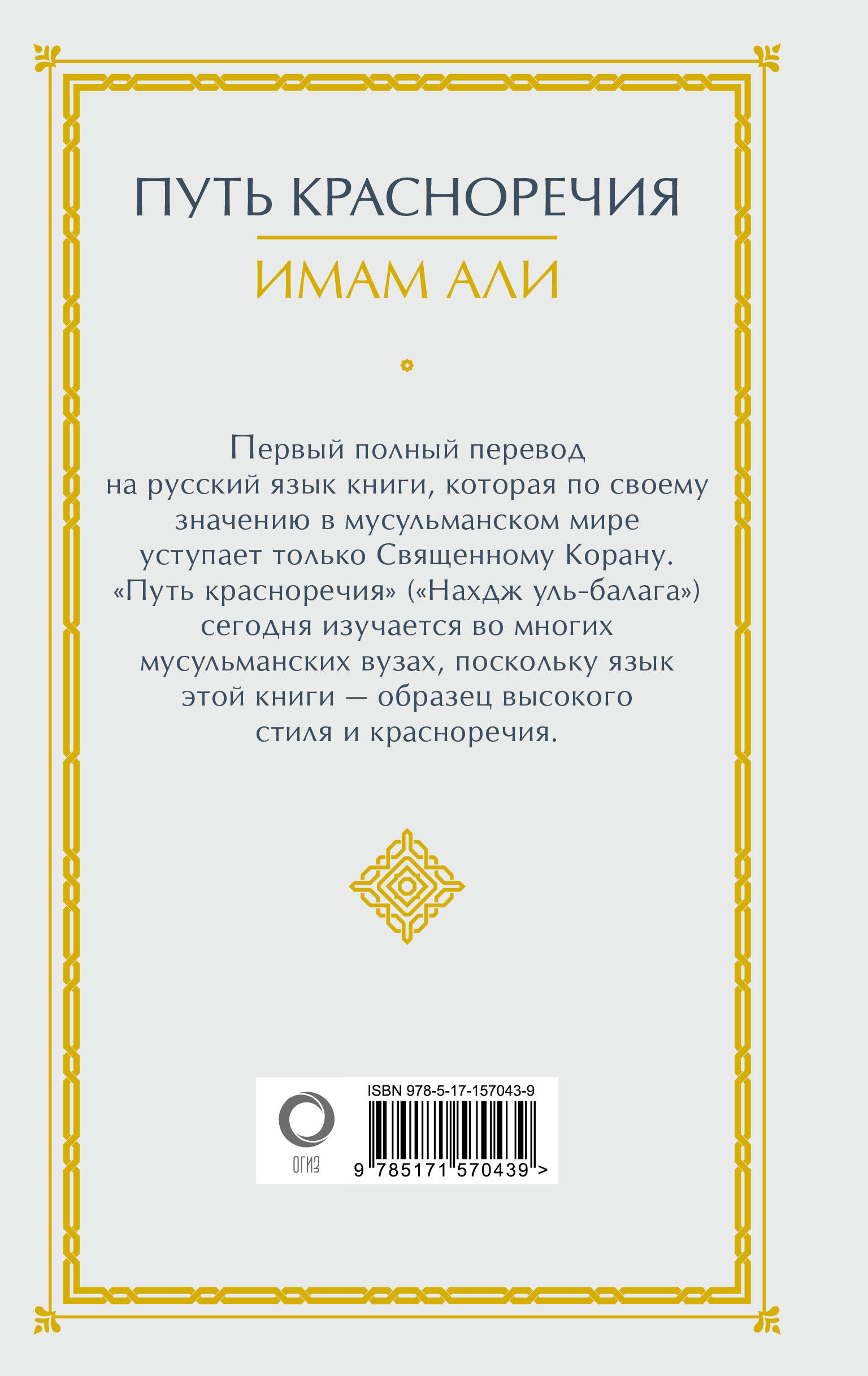 Первый полный перевод на русский язык книги, которая по своему значению в мусульманском мире уступает только Священному Корану. "Путь красноречия" ("Нахдж уль-балага") сегодня изучается во многих мусульманских вузах, поскольку язык этой книги - образец высокого стиля и крас- норечия. Книга предназначена для студентов и преподавателей гуманитарных вузов и широкого круга читателей.| Издательство | Издательство "АСТ" |