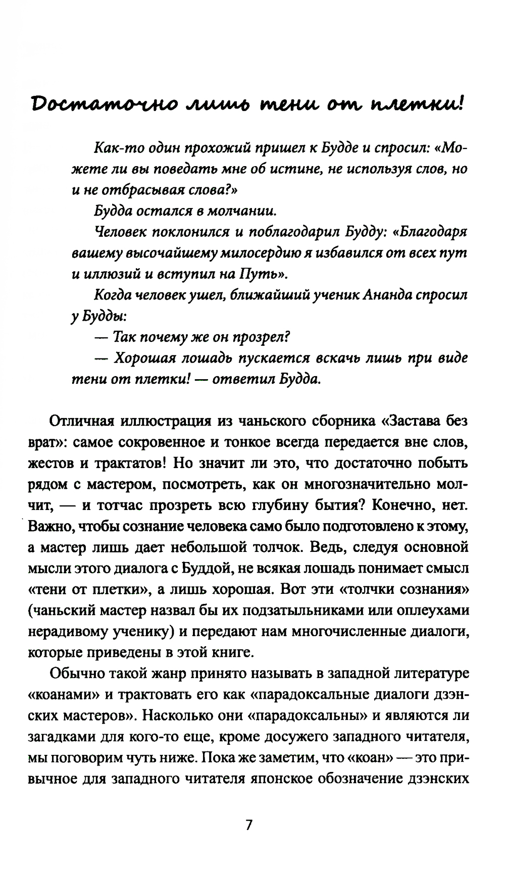 Как достичь просветления благодаря лишь одному слову? А благодаря молчанию? Для озарения мудростью не надо сложных методик - достаточно лишь успокоить свое сердце, очистить сознание и... оказаться рядом с достойным наставником. Именно в этом суть знаменитого восточного учения Дзэн (Чань). Книга представляет собой сборник лучших средневековых притч и рассказов о китайских мастерах Чань-буддизма, вошедших во многие классические произведения: «Застава без врат», «Записи о передаче светильника», «Речения с Лазурного утеса», «Престольная сутра Шестого патриарха». Издание также включает в себя справку об истории становления жанра чаньских речений «юйлу» и «парадоксальных диалогов» - коанов (гунъаней), о способах тренировки сознания буддийских монахов.| Издательство | Феникс |
