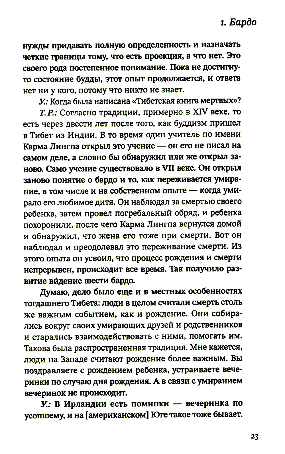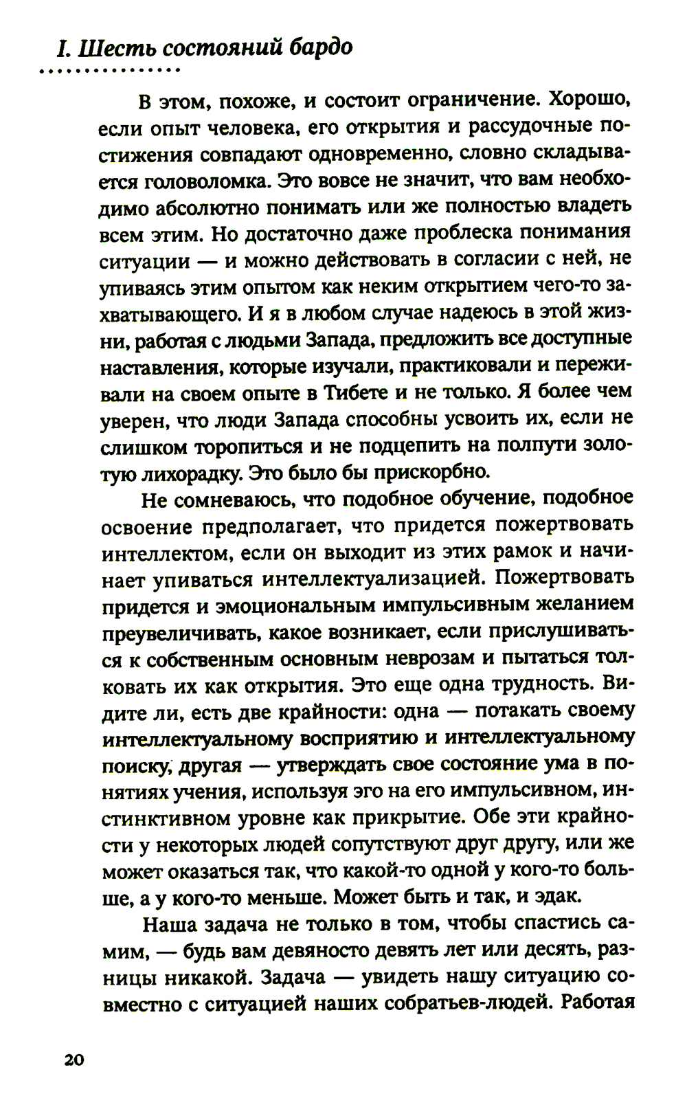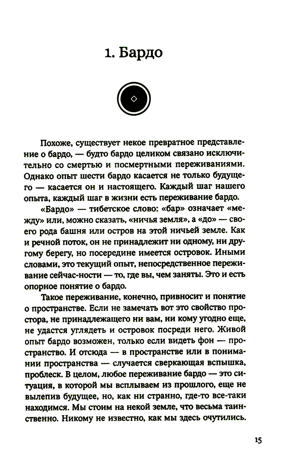 Тибетское слово «бардо» обычно ассоциируется с жизнью после смерти. В книге «За пределами безумия» Чогьям Трунгпа приглашает взглянуть на бардо совершенно иначе - как на пиковое переживание в любой заданный миг. Наш опыт настоящего всегда окрашен одним из шести психологических состояний: блаженством, присущим миру богов; завистью и стремлением развлекаться, характерными для мира ревнивых богов; страстью мира людей; невежеством животного мира; собственничеством и жадностью мира голодных духов; и, наконец, ненавистью и агрессией, свойственными миру обитателей ада. Соотнося эти миры с шестью переживаниями бардо, описанными в тибетской традиции, Трунгпа открывает нам «безумие» наших психологических привычек и повадок и показывает возможности преобразовывать повседневный опыт в свободу. Чогьям Трунгпа Ринпоче (1939-1987) - тибетский буддийский мастер, учитель, художник, переводчик и поэт, один из ключевых проводников Дхармы на Западе.| Издательство | Изд. Ганга |