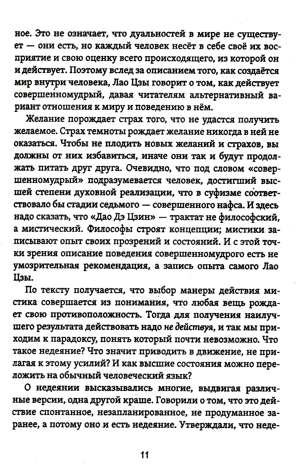 «Дао Дэ Цзин» - один из самых известных и наиболее загадочных мистических текстов в истории человечества. Он вызывает непреходящий интерес у философов, мистиков и искателей истины всех времён. Суфийский мастер Руслан Жуковец исследует древнюю мудрость даосов, исходя из собственного опыта следования Пути и взаимодействия с Высшим. Автор комментирует каждую главу Дао Дэ Цзин, открывая её практический и мистический смысл для духовного искателя. Что есть Дао, как прийти к гармонии с собой и с миром, что такое совершенная мудрость и как ее постичь, что значит жить в недеянии - вот лишь малый круг вопросов, ответ на которые даёт автор в своих комментариях. Книга представляет собой перевод мистических переживаний и истин с языка древнего мистика на язык тех, кто продолжает такую Работу сегодня. Сам этот опыт даёт ценнейший ключ к пониманию древних мистических текстов современным читателем. Книга будет интересна широкому кругу читателей - всем, кто интересуется философией, психологией, духовными и мистическими практиками, знанием о мироустройстве и человеке, и конечно же, тем, кто на себе почувствовал притяжение мудрости Лао Цзы.| Издательство | Амрита-Русь |