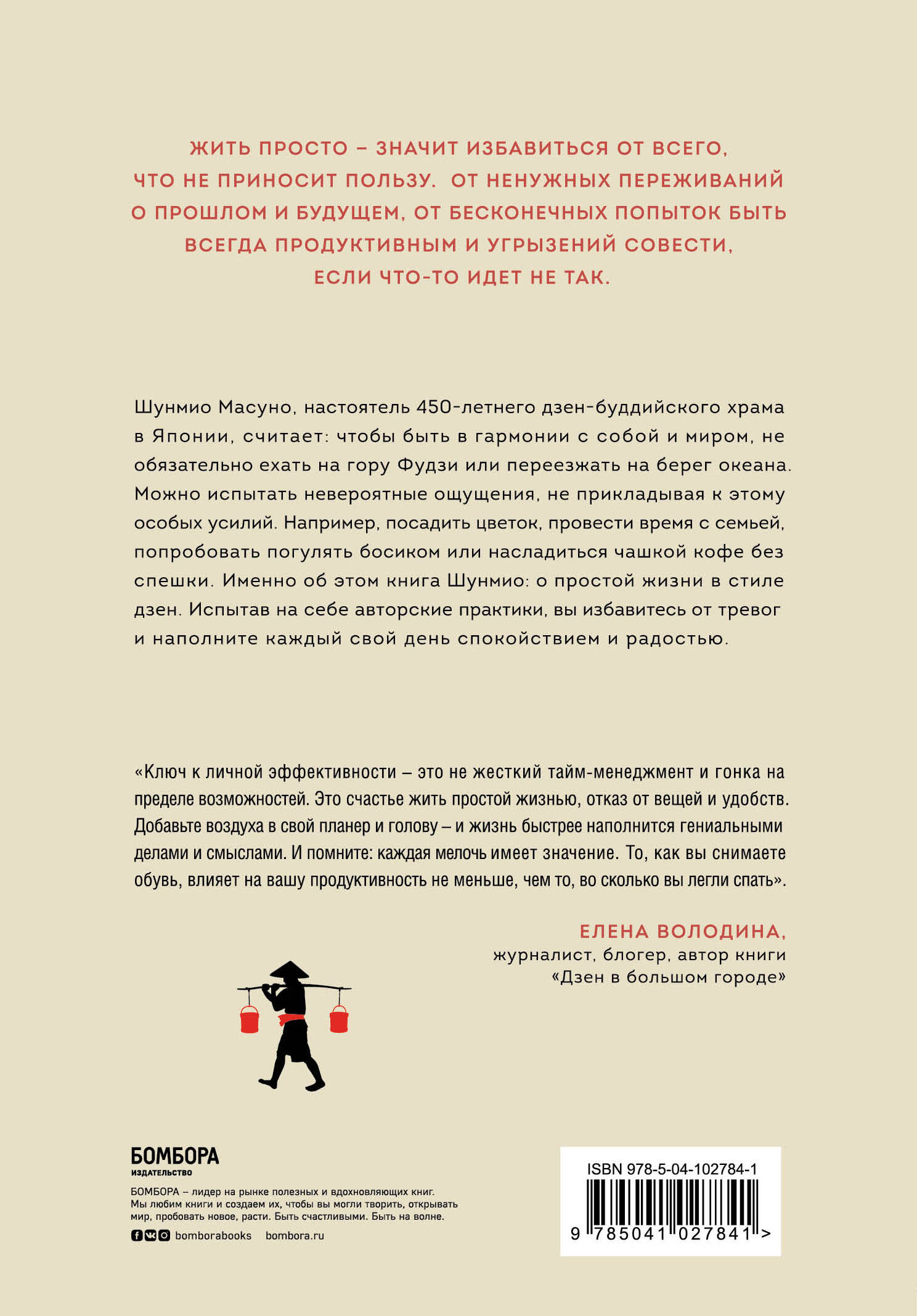 «Ключ к личной эффективности - это не жесткий тайм-менеджмент и гонка на пределе возможностей. Это счастье жить простой жизнью, отказ от вещей и удобств. Добавьте воздуха в свой планер и голову - и жизнь быстрее наполнится гениальными делами и смыслами. И помните: каждая мелочь имеет значение. То, как вы снимаете обувь, влияет на вашу продуктивность не меньше, чем то, во сколько вы легли спать». - Елена Володина, журналист, блогер, автор книги «Дзен в большом городе» «Делает для умственного беспорядка то же, что Мари Кондо сделала для беспорядка в доме». - Publishers Weekly «Бестселлер в Японии, который, безусловно, найдет отклик у поклонников практики Дзен или тех, кто просто хочет избавиться от занятого ума». - Publishers Weekly ОБ АВТОРЕ: Шунмио Масуно - настоятель 450-летнего дзен-буддийского храма в Японии, премированный дизайнер дзен-буддийских садов для клиентов со всего света и профессор природоохранного проектирования в одной из ведущих японских школ искусств. Он выступал с лекциями в Гарвардской школе дизайна, Корнельском и Брауновском университетах. ЦИТАТЫ: • Мы не можем изменить происходящее в жизни, но в наших силах решать, как воспринимать его. • Найти время, чтобы ни о чем не думать - это первый шаг к простой жизни. • Время от времени практикуй отказ от удобств. • Вместо того чтобы метаться и выбирать из множества, сосредоточься на чем-то одном. • Гибкий ум не привязывается к прошлому и не пытается бороться с переменами.| Издательство | ООО "Издательство "Эксмо" |