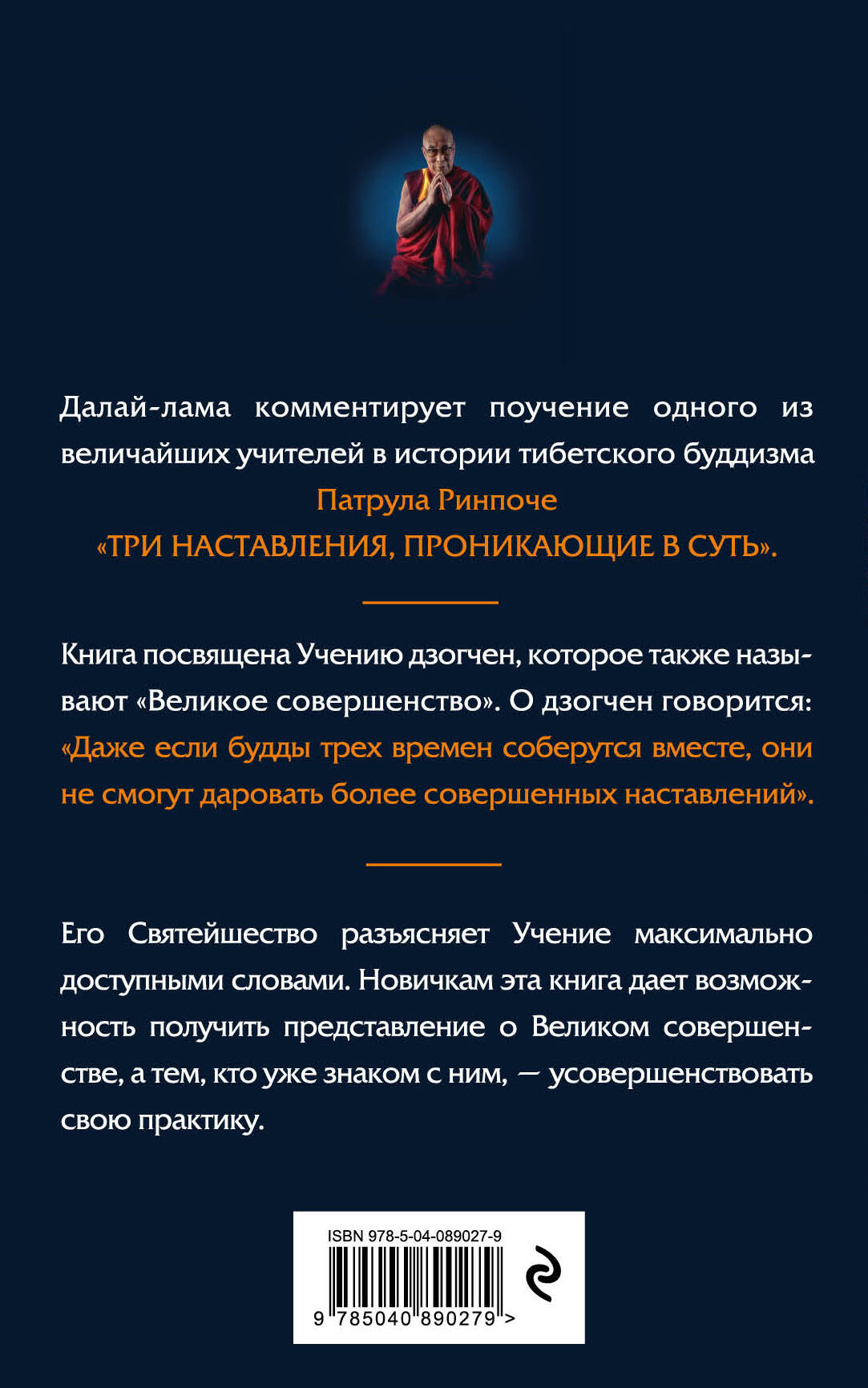 Эта книга - уникальная возможность для новичков познакомиться с высшим учением тибетского буддизма, и совершенствовать свое знание - для уже практикующих его. Далай-лама ясными и простыми словами разъясняет основы учения Великое совершенство (дзогчен), комментируя текст «Три наставления, проникающие в суть» одного из величайших учителей в истории тибетского буддизма Патрула Ринпоче.