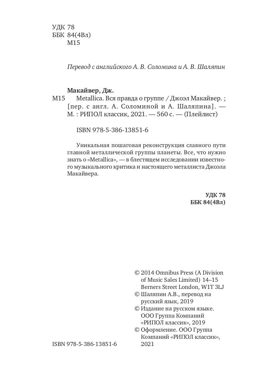Уникальная пошаговая реконструкция славного пути главной металлической группы планеты. Все, что нужно знать о «Metallica», - в блестящем исследовании известного музыкального критика и настоящего металлиста Джоэла Макайвера.| Издательство | Рипол Классик |