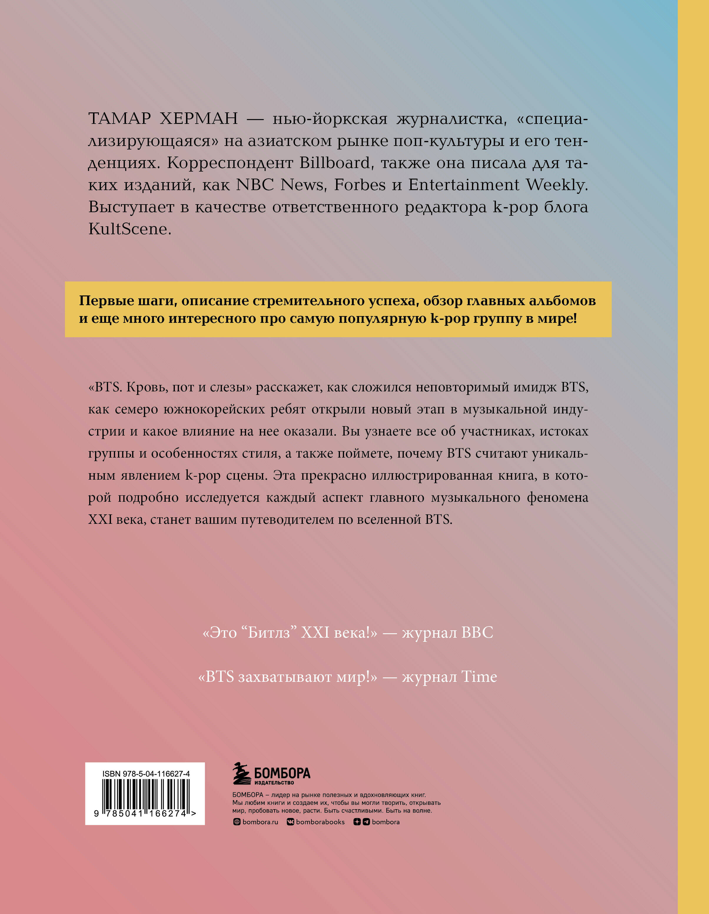 Эта книга о том, как семеро южнокорейских ребят изменили мировой музыкальный порядок и создали феноменально успешную группу, превратившую их в молодых звезд международного масштаба. Они покорили сердца слушателей и цифровое пространство, отменили языковые барьеры, заговорили с публикой на важные и сложные темы и навсегда обеспечили себе место в музыкальной истории. «BTS: кровь, пот и слезы» - отчасти биография, отчасти небольшое исследование. В ней есть подробный обзор дискографии, интересные факты об особенностях K-Pop стиля и, конечно же, рассказ о творческой эволюции группы. А также прекрасные фотографии, истории всех участников, размышления о секрете притягательности «пуленепробиваемых бойскаутов» и многое другое о вселенной BTS. Джину, Suga, J-hope, RM, Чимину, V и Чонгуку удалось преодолеть границы музыки и сцены и стать для своей бесконечно любящей публики чем-то большим, чем просто K-Pop группа.| Издательство | ООО "Издательство "Эксмо" |