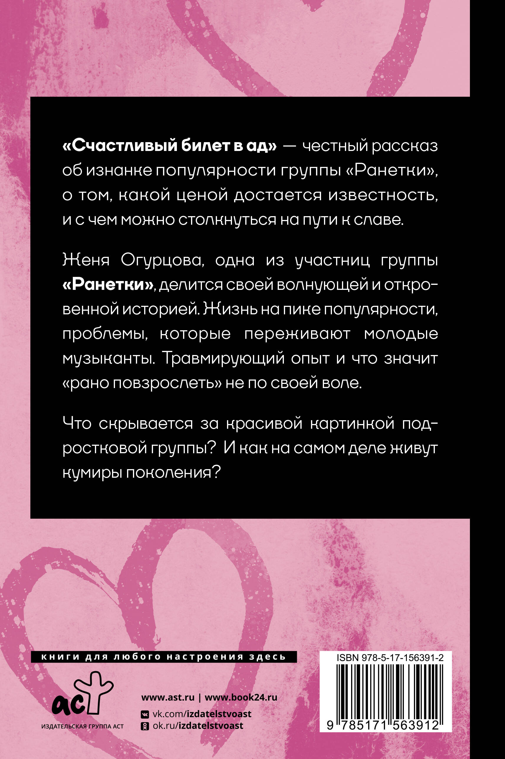 "Счастливый билет в ад" - честный рассказ об изнанке популярности группы "Ранетки", о том, какой ценой достается известность, и с чем можно столкнуться на пути к славе. Женя Огурцова, одна из участниц группы "Ранетки", делится своей волнующей и откровенной историей. Жизнь на пике популярности, проблемы, которые переживают молодые музыканты. Травмирующий опыт и что значит "рано повзрослеть" не по своей воле. Что скрывается за красивой картинкой подростковой группы? И как на самом деле живут кумиры поколения?| Издательство | ИЗДАТЕЛЬСТВО "АСТ" |