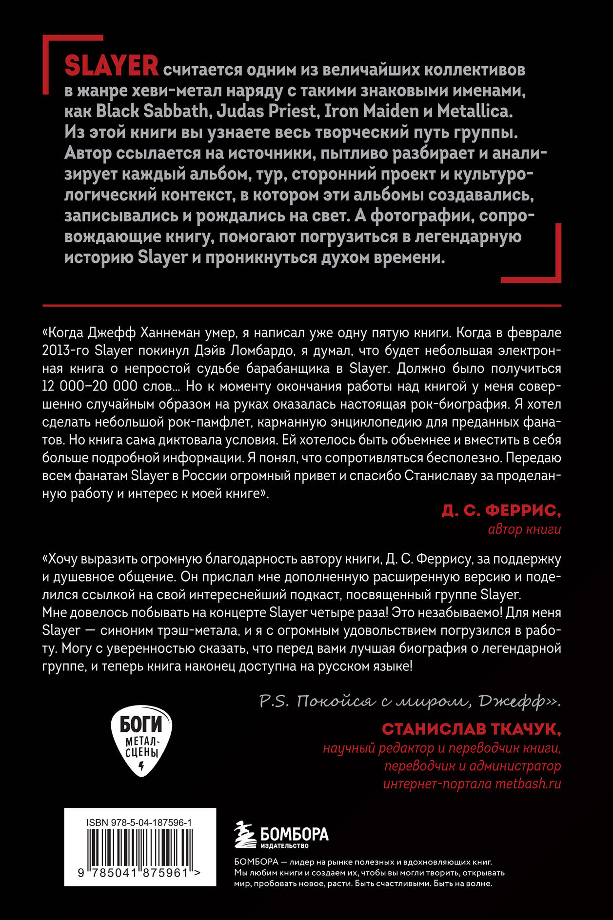 Важнейшая иллюстрированная биография Slayer читается на одном дыхании. Словно смотришь историческое документальное кино! Сложно объяснить феномен трэш-группы Slayer тем, кто не слушал их в 80-х и 90-х. Может быть, дело в том, что фанаты Slayer - это своеобразный культ, однако кажется, что у каждого из нас среди друзей найдется энтузиаст и эксперт по творчеству Slayer. Группа считается одним из величайших коллективов в жанре «хеви-метал» наряду с такими знаковыми именами, как Black Sabbath, Judas Priest, Iron Maiden и Metallica. В этой книге описывается весь творческий путь группы. Автор ссылается на источники, пытливо разбирает и анализирует каждый альбом, тур, сторонний проект и культурологический контекст, в котором эти альбомы создавались, записывались и рождались на свет. Д.С. Феррис начал писать книгу еще до того, как в мае 2013 года не стало Джеффа Ханнемана. Автор провел часовые интервью с музыкантами Slayer и многочисленными источниками. Все начинается с детства в Калифорнии, репетиций в гараже, гастролей на «Шевроле Камаро», а затем мы попадаем в зарождающуюся метал-сцену района залива Сан-Франциско начала 80-х. Феррис подробно исследует период, когда группы, игравшие в гаражах и клубах, постепенно стали собирать арены и стадионы, и Slayer, вероятно, оказались лучшими представителями жанра «трэш-метал». В 1986-1987 хеви-метал достиг коммерческого пика. Slayer, Metallica, Testament, Exodus и Anthrax выпустили знаковые для жанра альбомы и не упустили своего шанса. В 1986 году Slayer обрушили на ничего не подозревающий мир альбом Reign in Blood, молниеносный шквал трэша, длившийся всего 28 минут. Он легко умещался на одну сторону кассеты, и его можно было прослушать дважды. Reign in Blood считается культовой пластинкой и эталоном жанра. Песни стали короче, тексты - серьезнее, а владение музыкальными инструментами и вовсе достигло невероятного уровня (интересно отметить, что Рик Рубин продюсировал Reign in Blood в один год с классической работой Beastie Boys License to Ill - это к слову о том, как сильно музыка менялась в 1986 году). После Reign in Blood группа выпустила второй альбом из культовой трилогии (записанной первым составом) - South Of Heaven (1988) и Season in the Abyss (1990). Несмотря на то что потом Slayer выпустили еще несколько альбомов, группе так и не удалось приблизиться к уровню трех своих классических работ. Можно сказать, что в середине 90-х, с появлением гранжа, нью-метала и электронной музыки, трэш-метал и Slayer просели и прилично сбавили обороты. Годы изнурительных гастролей и постоянные смены барабанщиков вымотали железных титанов. В книге присутствует множество интересных фактов. К примеру, в конце 90-х Джефф Ханнеман страдал артритом, а Керри Кинг в самом начале карьеры проходил «стажировку» в Megadeth и учился у Дэйва Мастейна. А Дэйва Ломбардо учил играть на бочках небезызвестный ныне Джон Хоглан по прозвищу «Атомные часы». Книга представляет интерес не только для фанатов группы и жанра, но и для всех, кто интересуется музыкой в целом. Автор подробно рассказывает о причине ухода Дэйва Ломбардо и, самое главное, проливает свет на преждевременный распад Slayer. Учитывая, что группа уже завершила музыкальную деятельность, книга станет отличным историческим справочником и путеводителем в мир легендарных Slayer.| Издательство | ООО "Издательство "Эксмо" |