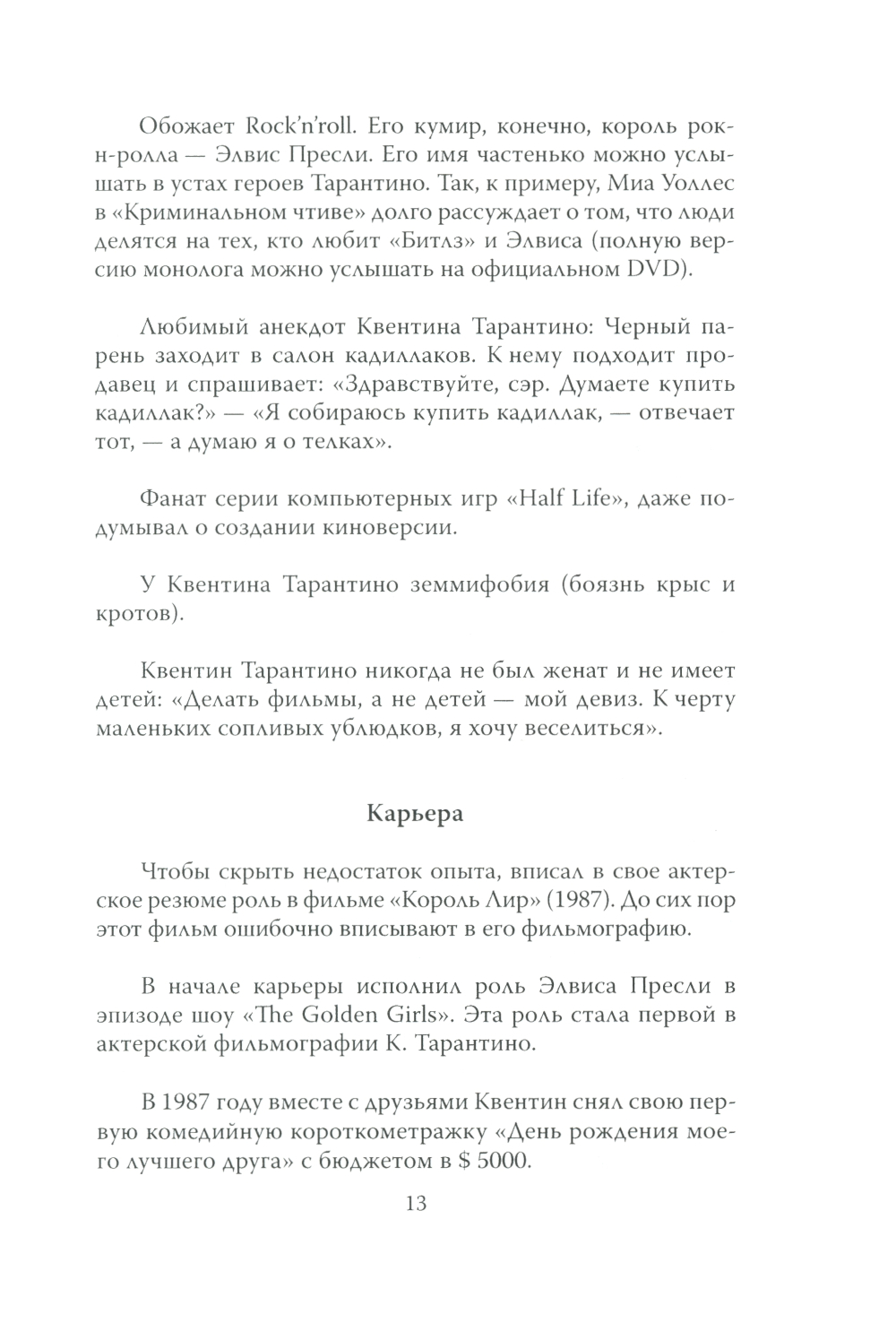 «А в начале пути мало кто в нас верил, не правда ли?» - сказал Квентин Тарантино на премьере фильма «Криминальное чтиво». Диалоги на грани фола, стрельба и потерявшиеся в жизни бродяги, - в этом весь Тарантино, гений мирового кинематографа. Его жизнь, его интервью, его фильмы - всегда на грани фола и за пределом обыденного юмора. Каждая шутка - это нечто большее. «Большие идеи портят кино. Если ты снимаешь фильм о том, что война - это плохо, то зачем ты вообще снимаешь кино? Просто скажи: "Война - это плохо". Это всего два слова. Вернее, три…». Каждая его фраза, каждый диалог - это бешеный микс из философии и юмора. Как жить в стиле Тарантино? В стиле его героев? Об этом книга, которую вы держите в руках. Вот только стоит помнить… Для кого эта книга? Для тех, кто хочет посмеяться. Для тех, кто хочет подумать. Для тех, кто любит кино. «Победителей ведь никто не любит, не правда ли?» (Квентин Тарантино)