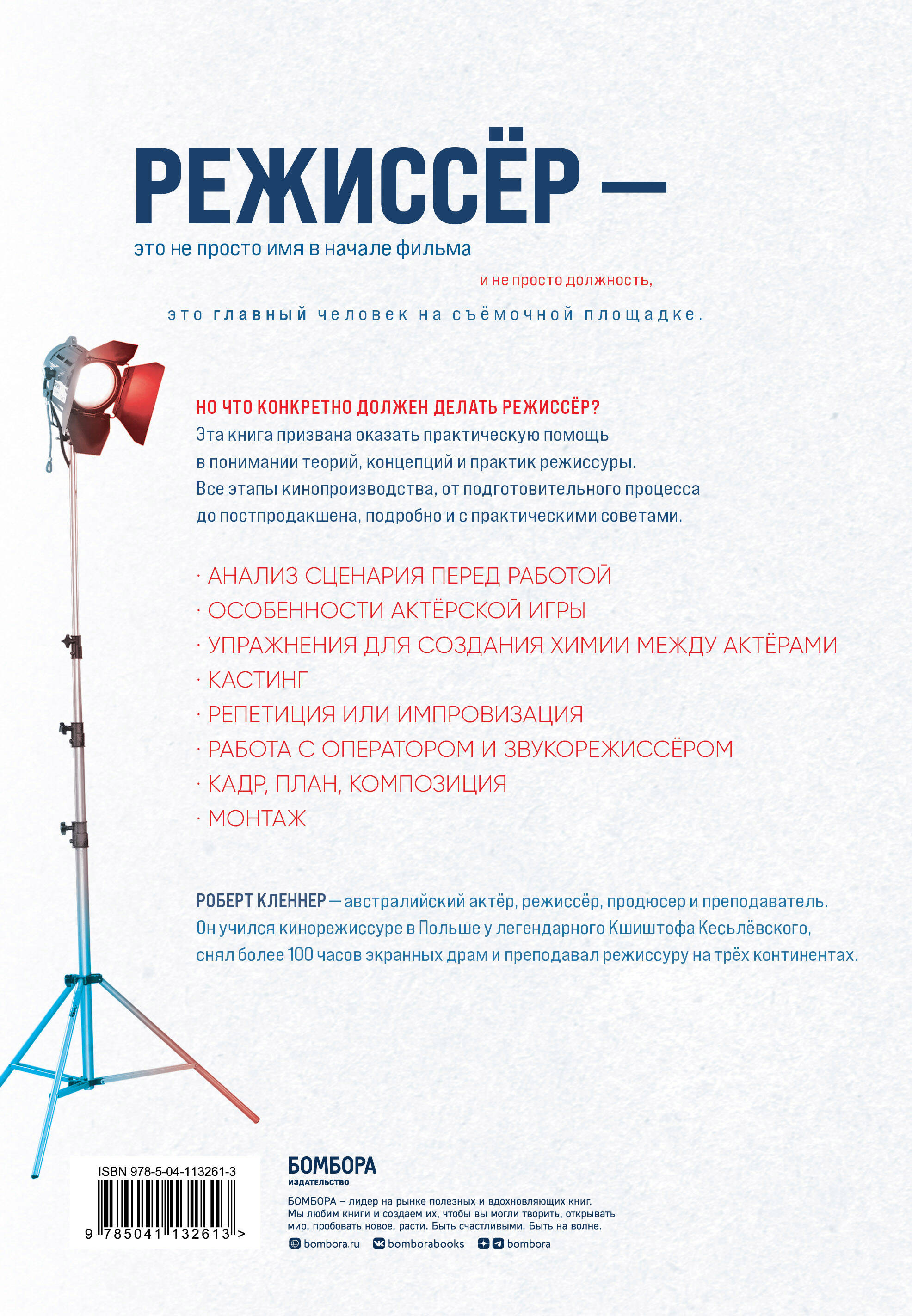 Режиссер - это не просто имя в начале фильма и не просто должность, это колоссальный труд. Режиссер - главный человек на съемочной площадке. Он руководит процессом, создает новый мир и контролирует не только артистов, но и зрителей. Но как именно? Что конкретно должен делать режиссер? Эта книга поможет взглянуть на эту профессию с самой что ни на есть прикладной стороны. Все этапы кинопроизводства, от подготовительного процесса до постпродакшена, подробно и с практическими советами: • Анализ сценария перед работой. • Особенности актерской игры. • Упражнения для создания химии между актерами. • Кастинг. • Репетиция или импровизация. • Работа с оператором и звукорежиссером. • Кадр, план, композиция. • Монтаж. Как выбрать крупность плана? Какой звук бывает в кино? Как работать с актерами детьми? Может ли цвет усилить впечатление от сцены? На примере популярных фильмов автор подробно рассказывает о каждом шаге режиссера. Роберт Кленнер - австралийский актер, режиссер, продюсер и преподаватель. Он учился кинорежиссуре в Польше у легендарного Кшиштофа Кесьлёвского, снял более 100 часов экранных драм и преподавал режиссуру на трех континентах.| Издательство | ООО "Издательство "Эксмо" |