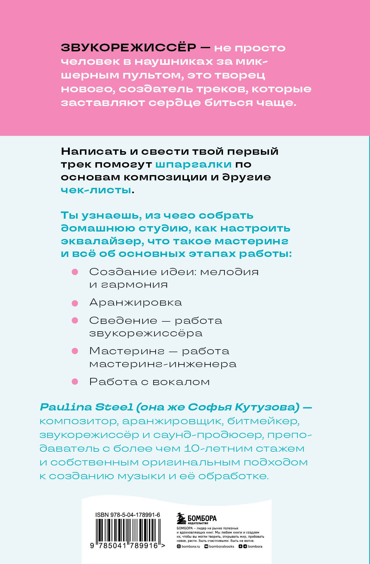 Хочешь создавать бомбические треки, но не знаешь, что делать? Опытный саундпродюсер расскажет тебе, с чего начать, каких ошибок избегать и как поймать вдохновение. Эта книга проведет тебя по всем этапам создания трека: • Создание идеи: мелодия и гармония. • Аранжировка. • Сведение - работа звукорежиссера. • Мастеринг - работа мастеринг-инженера. • Запись вокала. Написать и свести твой первый трек уже завтра тебе помогут шпаргалки по основам композиции и другие чек-листы. Ты узнаешь, из чего собрать домашнюю студию, порядок действий при сведении, как настроить эквалайзер и что такое мастеринг. Paulina Steel (она же Софья Кутузова) - композитор, аранжировщик, битмейкер, звукорежиссер и саундпродюсер, преподаватель с более чем 10-летним стажем и собственным оригинальным подходом к созданию музыки и её обработке. Для Paulina Steel каждая композиция, какого бы стиля она ни была, - уникальное произведение искусства, в котором она реализует весь свой потенциал, создавая лучшее из возможного. Комплексные знания и опыт работы в различных областях музыкального искусства позволяют Paulina Steel создавать неповторимые по своему содержанию и качеству композиции с широчайшим диапазоном используемых музыкальных стилей. И эта книга - квинтэссенция ее знаний.| Издательство | ООО "Издательство "Эксмо" |