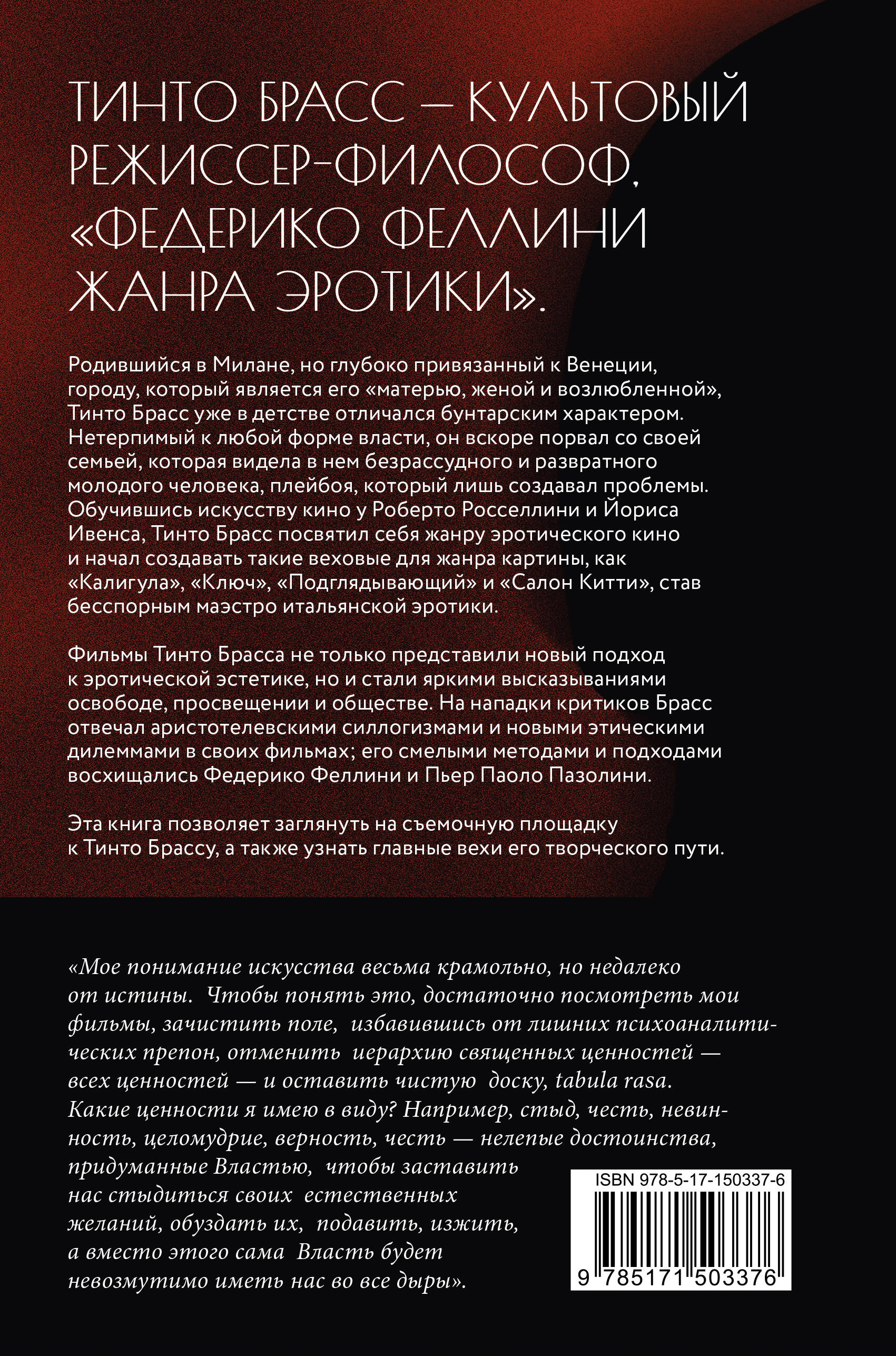 Родившийся в Милане, но глубоко привязанный к Венеции, городу, который является его "матерью, женой и возлюбленной", Тинто Брасс уже в детстве отличался бунтарским характером. Нетерпимый к любой форме власти, он вскоре порвал со своей семьей, которая видела в нем безрассудного и развратного молодого человека, плейбоя, который лишь создавал проблемы. Обучившись искусству кино у Роберто Росселлини и Йориса Ивенса, Тинто Брасс посвятил себя жанру эротического кино и начал создавать такие веховые для жанра картины, как "Калигула", "Ключ", "Подглядывающий" и "Салон Китти", став бесспорным маэстро итальянской эротики. Фильмы Тинто Брасса не только представили новый подход к эротической эстетике, но и стали яркими высказываниями о свободе, просвещении и обществе. На нападки критиков Брасс отвечал аристотелевскими силлогизмами и новыми этическими дилеммами в своих фильмах; его смелыми методами и подходами восхищались Федерико Феллини и Пьер Паоло Пазолини. Эта книга позволяет заглянуть на съемочную площадку к Тинто Брассу, а также узнать главные вехи его творческого пути.| Издательство | ИЗДАТЕЛЬСТВО "АСТ" |