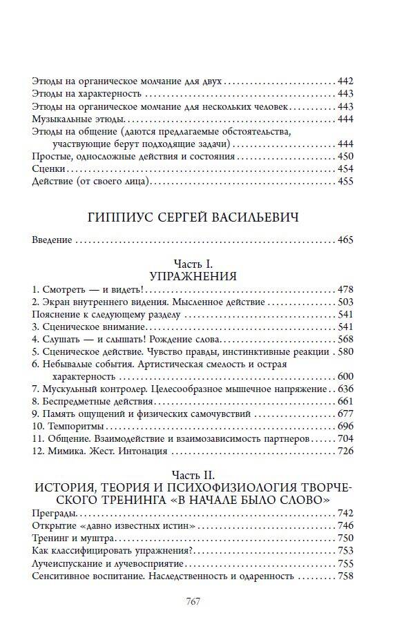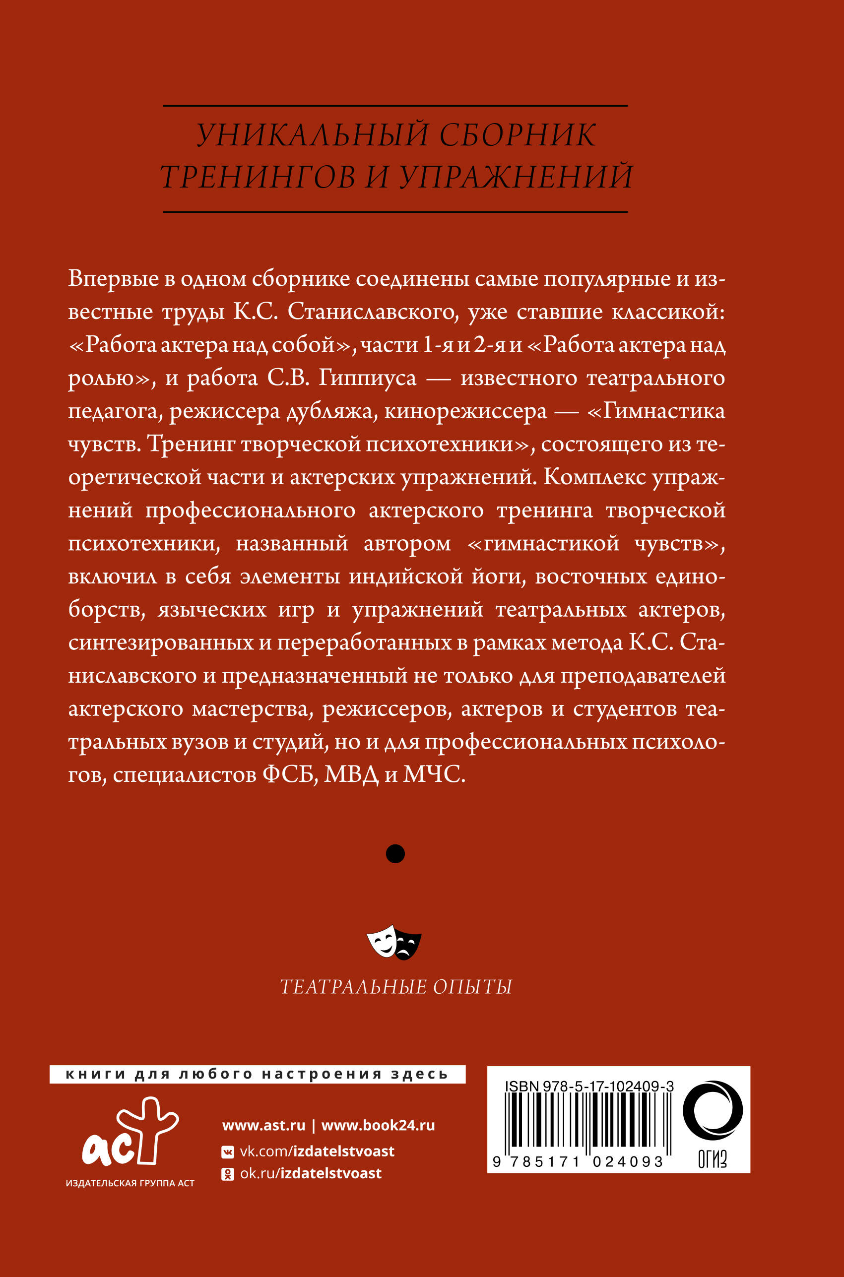 Впервые в одном сборнике соединены самые популярные и известные работы К.С. Станиславского уже ставшие классикой "Работа актера над собой", часть 1 и 2 и "Работа актера над ролью", и С.В. Гиппиуса - известного театрального педагога, режиссера дубляжа, кинорежиссера. "Гимнастика чувств". Тренинг творческой психотехники", состоящего из теоретической части из 400 актерских упражнений. Комплекс упражнений профессионального актерского тренинга творческой психотехники, названный автором "гимнастикой чувств", включил в себя элементы индийской йоги, восточных единоборств, языческих игр и упражнений театральных актеров, синтезированных и переработанных в рамках метода К. С. Станиславского и предназначенный не только для преподавателей актерского мастерства, режиссеров, актеров и студентов театральных вузов и студий, но и для профессиональных психологов, специалистов ФСБ, МВД и МЧС.Открытые и внедренные в практику Гиппиусом приемы широко используются как в театральной педагогике, так и в психологии в качестве системы развития познавательных и эмоционально-волевых процессов.
