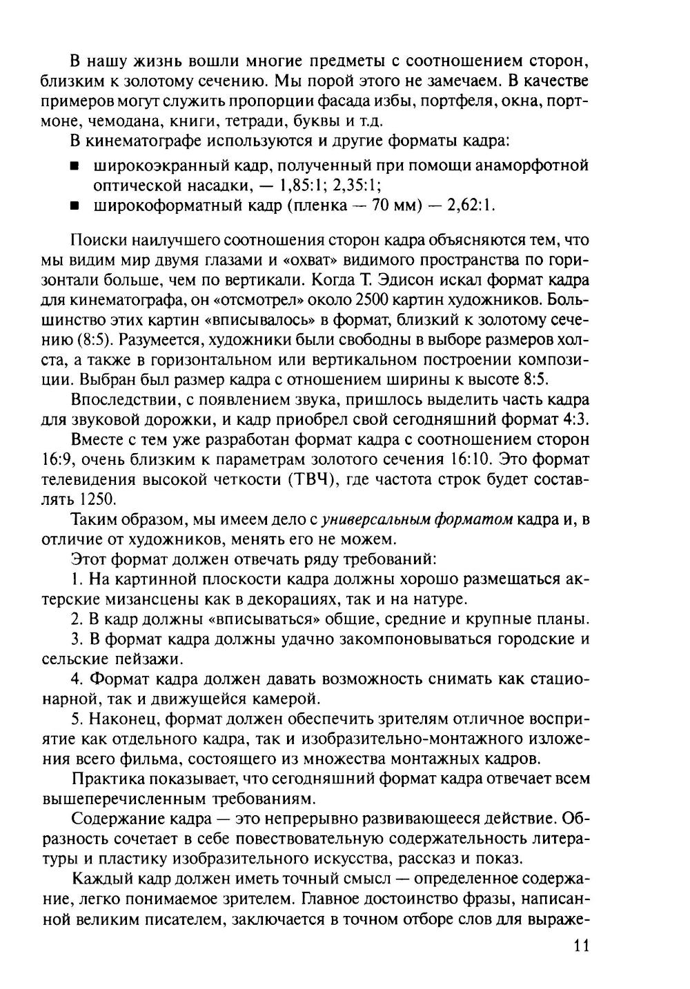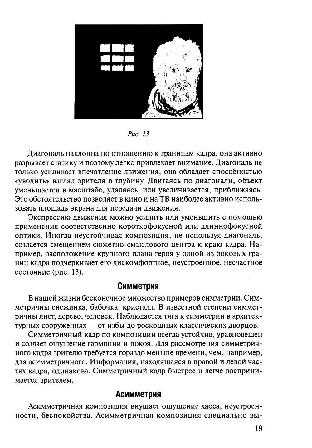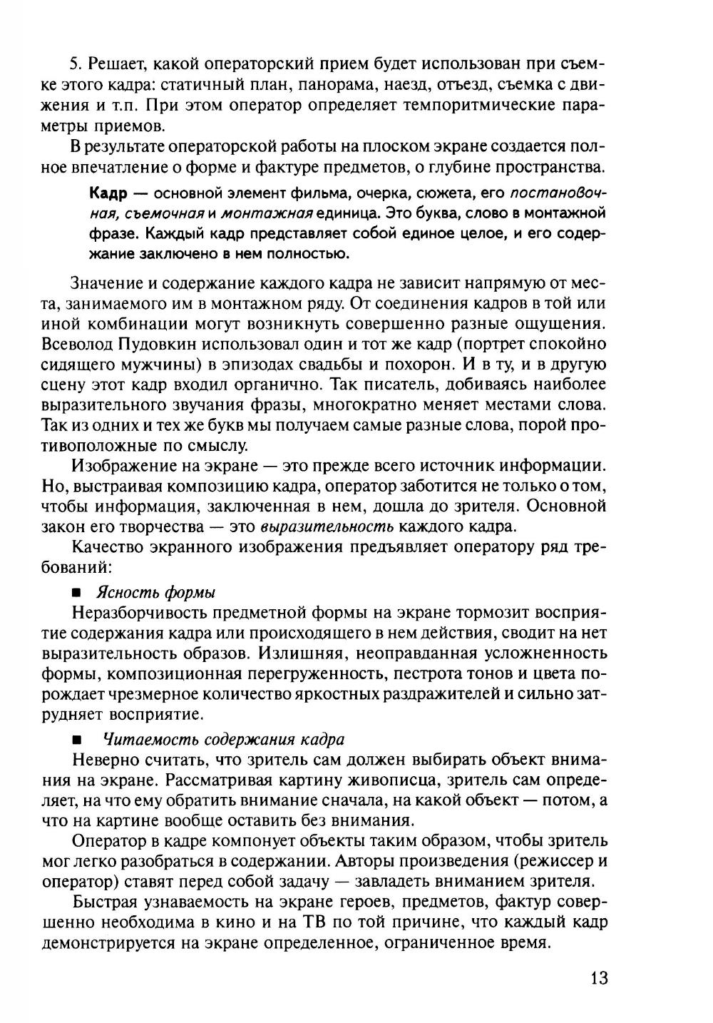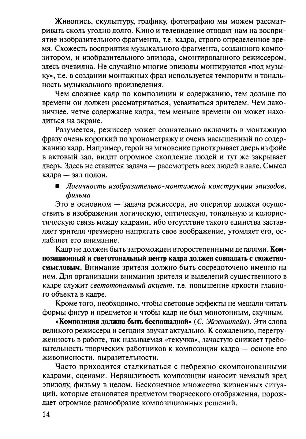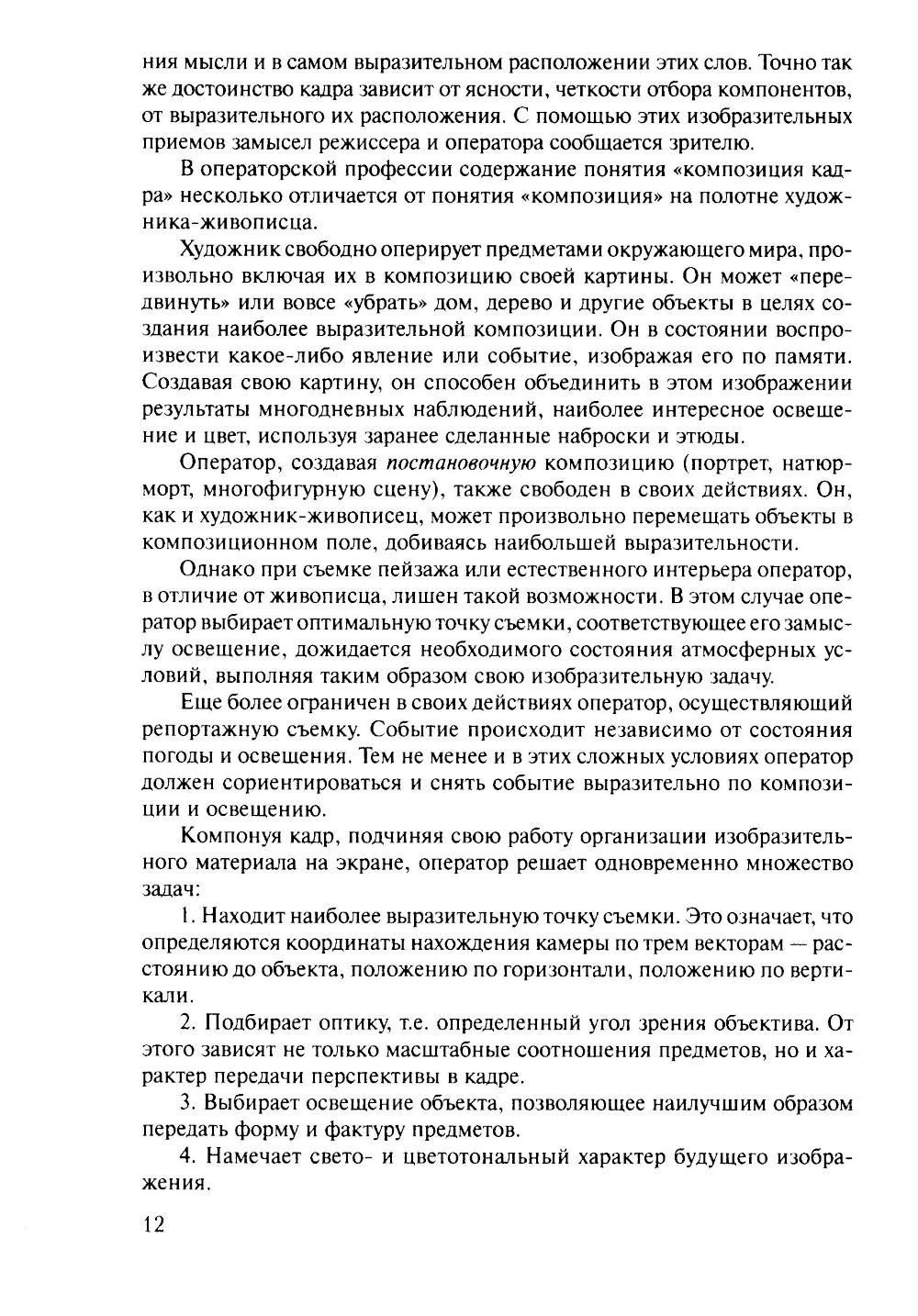 Помимо общих сведений о композиции и работе оператора со светом - основных дисциплинах профессии, автор видит свою задачу в том, чтобы научить читателей профессионально «читать и понимать» произведения изобразительного искусства, созданные живописцами, фотографами, кино- и телеоператорами в фильмах и передачах, вызвать желание учиться у различных мастеров, а также активно фантазировать самим в повседневной работе. Книга предназначена для операторов, желающих повысить свою квалификацию, и для всех интересующихся этой профессией.| Издательство | Аспект-Пресс |