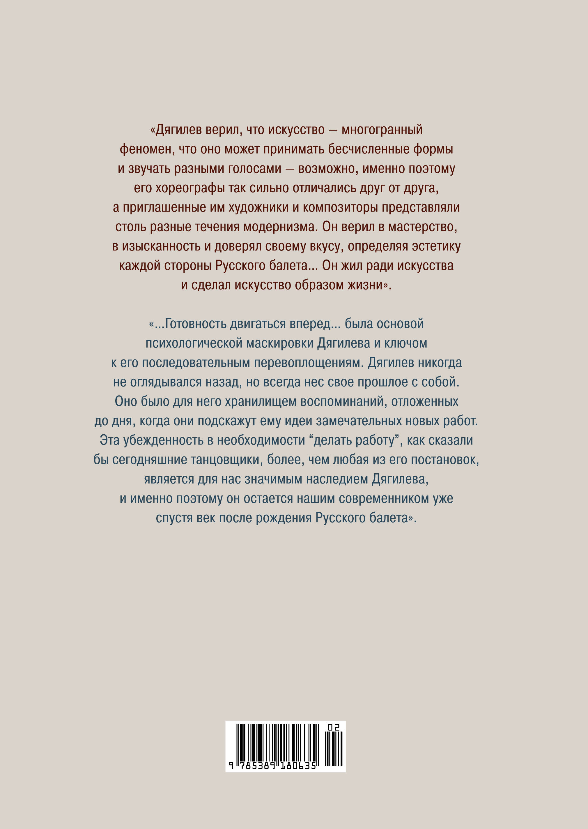 "Русский балет Дягилева" - знаменитая монография Линн Гарафолы - профессора кафедры танца Колумбийского университета, члена Американской академии искусства и науки, ведущего специалиста по истории Русского балета. "История балета ХХ века не знала труппы, которая оставила бы в ней столь же глубокий и влиятельный след, как Русский балет Дягилева. Он просуществовал всего двадцать лет - с 1909 по 1929 год, - но за эти два десятилетия успел превратить балет в живое, современное искусство… На протяжении всего своего существования эта труппа была центром притяжения ярких, талантливых, исключительных личностей. Но одна фигура возвышалась над всеми остальными - Сергей Дягилев, выдающийся импресарио, руководивший Русским балетом с первых дней его возникновения до самой своей смерти в 1929 году. Это был человек железной воли и чрезвычайно тонкого вкуса, обладавший энциклопедическими знаниями и страстной любознательностью, - своеобразный Наполеон от искусств - и вместе с этим личность масштабов эпохи Возрождения".| Издательство | Азбука-Аттикус Издат.группа ООО |
