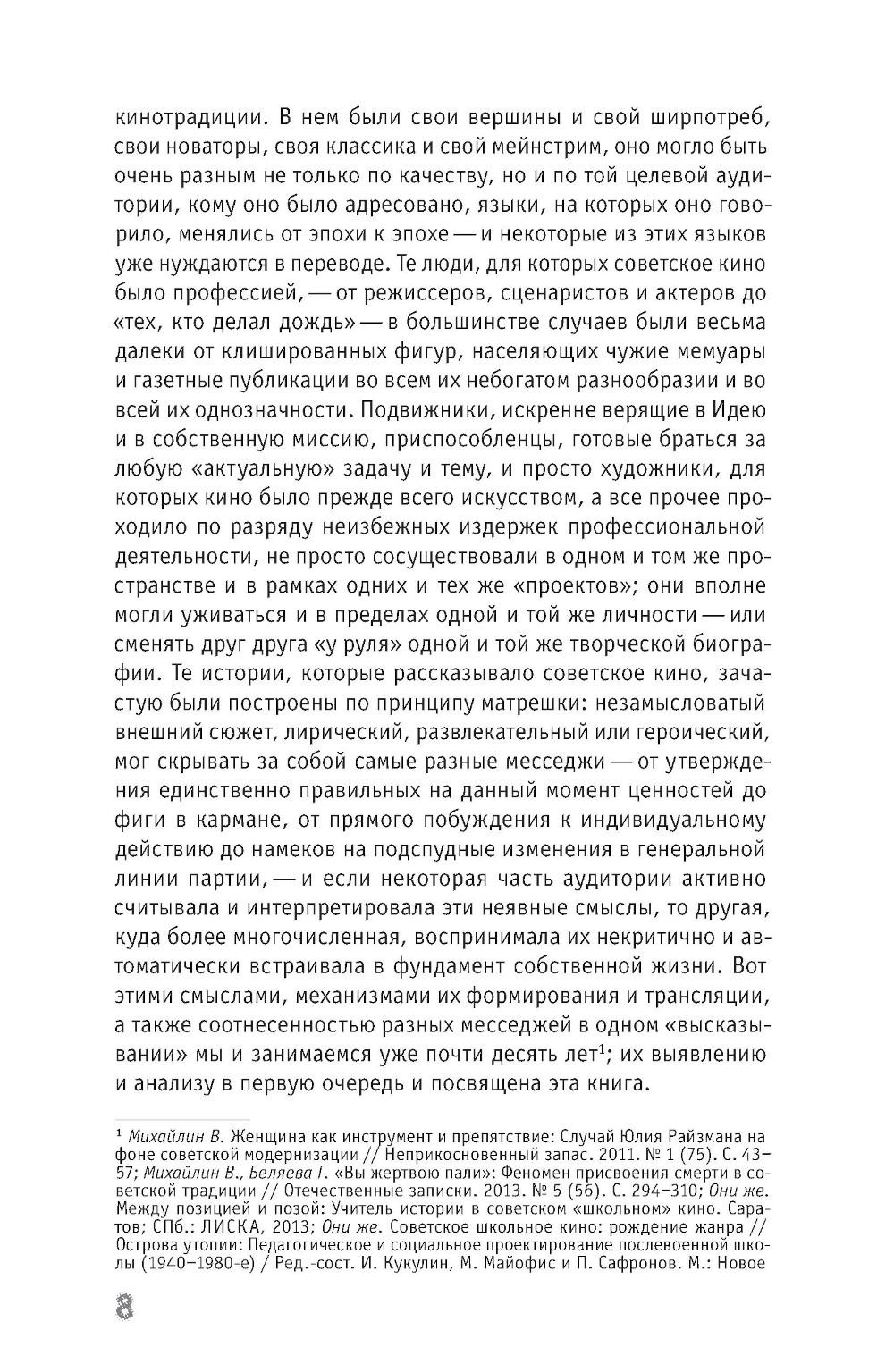 Советское «школьное кино» - крайне любопытное явление в истории мирового кинематографа, основанное на специфическом компромиссе пропагандистских установок и социальных запросов аудитории. Истории, которые оно рассказывало, зачастую были построены по принципу матрешки: незамысловатый внешний сюжет мог скрывать в себе самые разные месседжи - от утверждения советских моральных ценностей до фиги в кармане, от поиска вариантов развития личности до намеков на изменения в генеральной линии партии. Тому, как формировались и транслировались эти смыслы, а также соотнесенности разных месседжей в одном «высказывании» и посвящена эта книга. Вадим Михайлин - историк культуры, социальный антрополог, профессор Саратовского государственного университета. Галина Беляева - старший научный сотрудник Саратовского государственного художественного музея имени А. Н. Радищева.