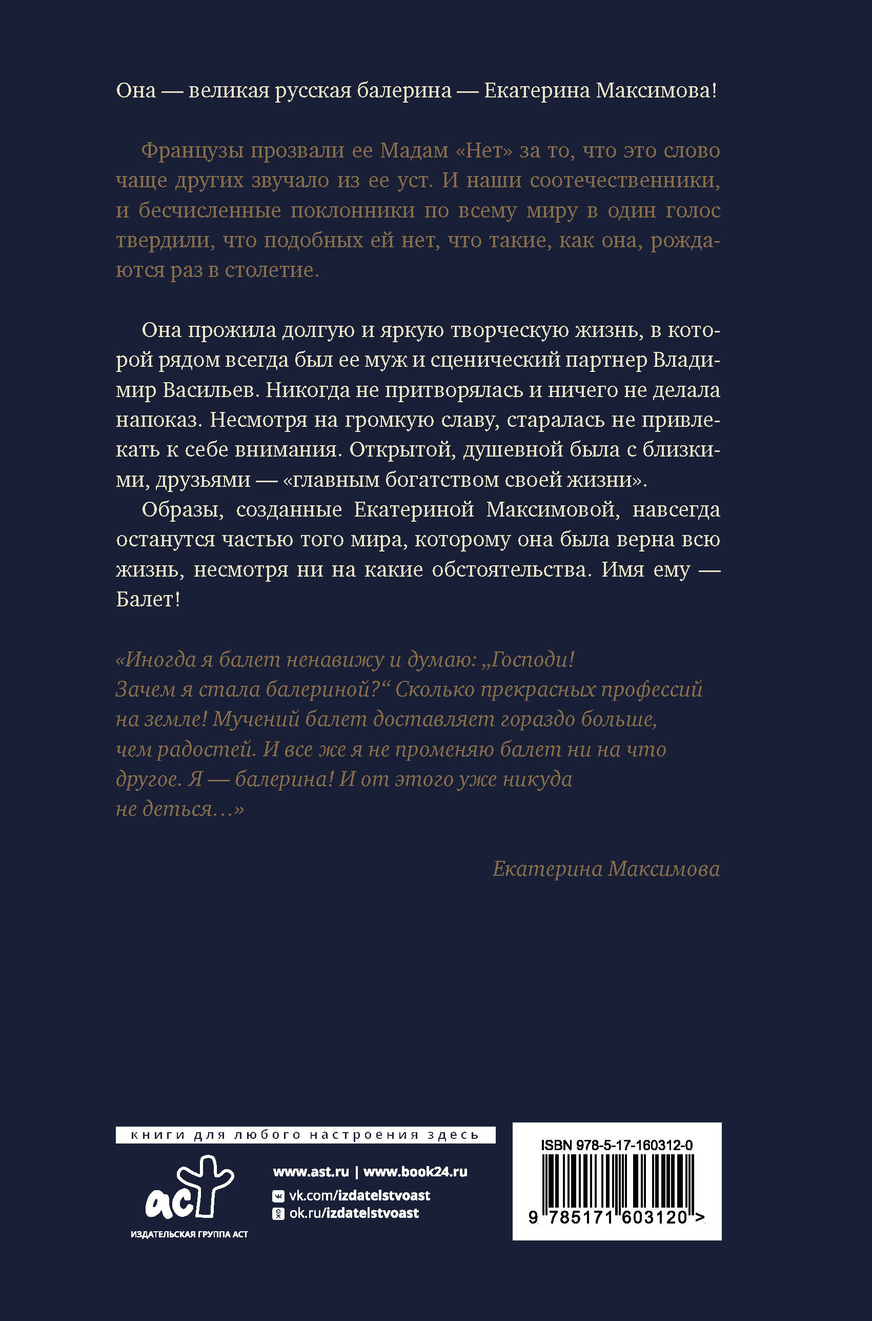 Она - быть может, самая очаровательная из балерин в истории балета. Немногословная и крайне сдержанная, закрытая и недоступная в жизни, на сцене и на экране она казалась воплощением света и радости - легкая,изящная, лучезарная, искрящаяся юмором в комических ролях, но завораживающая глубоким драматизмом в ролях трагических. "Богиня…" - с восхищением шептали у нее за спиной… Она великая русская балерина - Екатерина Максимова! Французы прозвали ее Мадам "Нет" за то, что это слово чаще других звучало из ее уст. И наши соотечественники, и бесчисленные поклонники по всему миру в один голос твердили, что подобных ей нет, что такие, как она, рождаются раз в столетие. Валентин Гафт посвятил ей стихи и строки: "Ты - вечная, как чудное мгновенье из пушкинско-натальевской Руси". Она прожила долгую и яркую творческую жизнь, в которой рядом всегда был ее муж и сценический партнер Владимир Васильев. Никогда не притворялась и ничего не делала напоказ. Несмотря на громкую славу, старалась не привлекать к себе внимания. Открытой, душевной была с близкими, друзьями - "главным богатством своей жизни". Образы, созданные Екатериной Максимовой, навсегда останутся частью того мира, которому она была верна всю жизнь, несмотря ни на какие обстоятельства. Имя ему - Балет!| Издательство | Издательство "АСТ" |