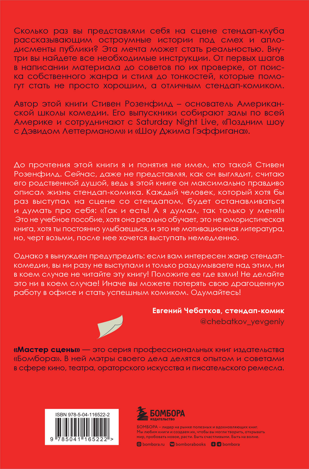 «Разве эта книга привлекла бы твое внимание в магазине, не будь у тебя чувства юмора? Протяни руку, я прочитаю по ладони. Всю жизнь окружающие говорили, как с тобой весело». Эта книга написана самым известным преподавателем комедии в США Стивеном Розенфилдом. В ней он собрал все необходимые инструкции, которые помогут вам стать успешным стендап-комиком. Книга состоит из пяти частей, каждая из которых поможет приблизиться к заветной мечте сделать карьеру, используя собственное чувство юмора. Вы узнаете: • с чего стоит начать карьеру в индустрии комедии и как написать свой первый сетлист; • какие виды стендап-выступлений существует и какой подойдет вам; • как добиваться наибольшого эффекта от шутки и находить удачные панчлайны; • как создать запоминающийся образ на сцене; • как довести средние шутки до категории А и многое другое! Книга написана остроумным и понятным языком, а все советы автора подкреплены реальными примерами из монологов топовых стендап-комиков: от Джорджа Карлина и Луи Си Кея до Криса Рока и Эдди Иззарда. Стивен Розенфилд - директор и основатель Американского института комедии. Вот уже 30 лет он учит и наставляет комиков и актеров, от начинающих до номинантов на «Оскар» и обладателей премий «Эмми». Его выпускники собирают залы по всей Америке и сотрудничают с "Saturday Night Live", «Поздним шоу с Дэвидом Леттерманом», «Шоу Джима Гэффигана» и т.д.| Издательство | ООО "Издательство "Эксмо" |