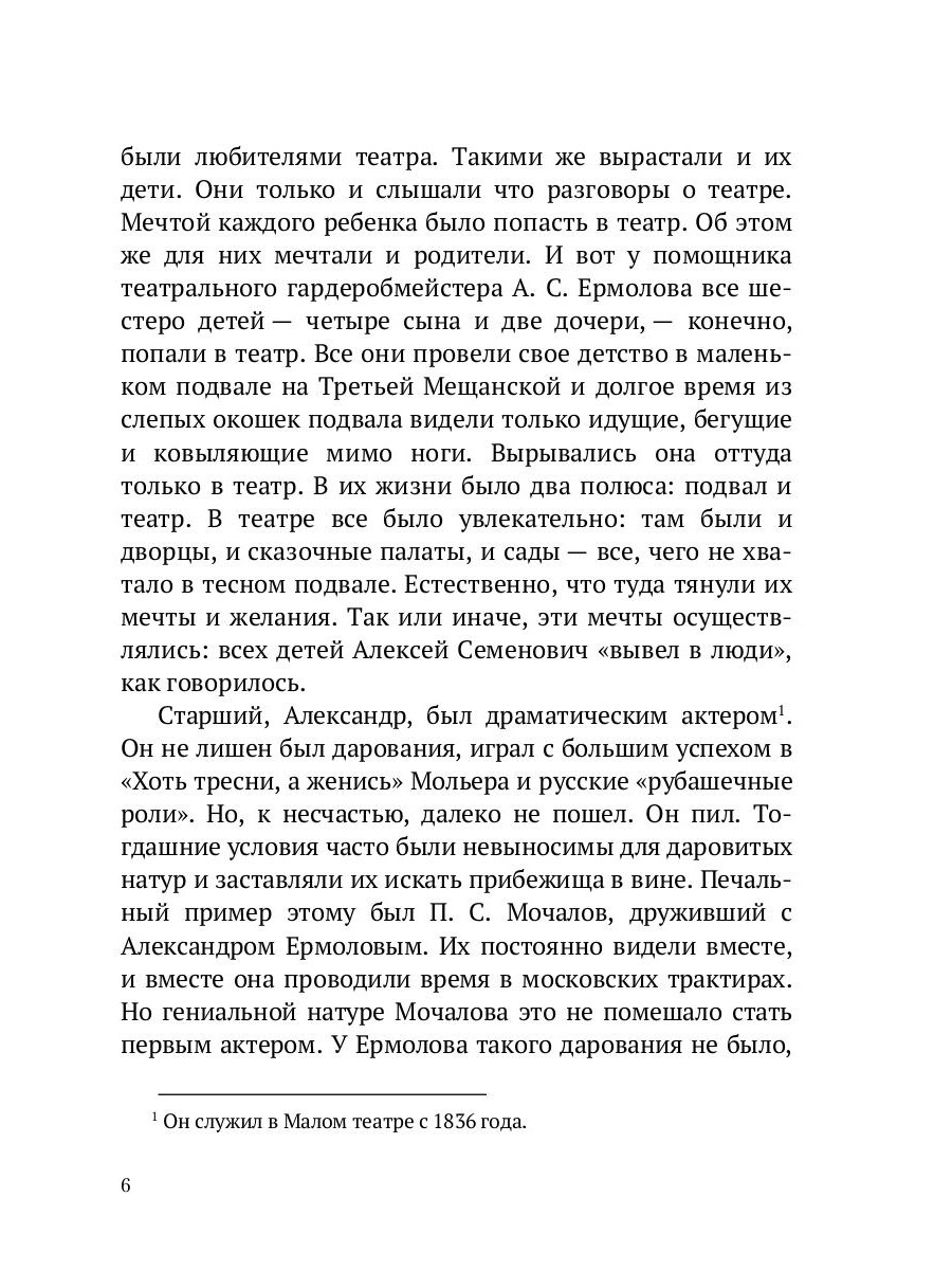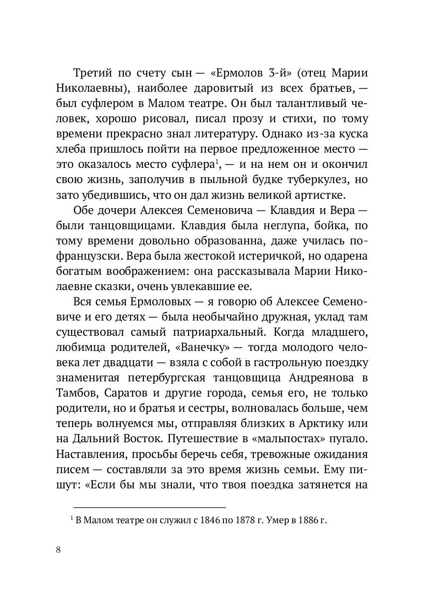 Мария Николаевна Ермолова (1853-1928) - легендарная театральная актриса, заслуженная артистка императорских театров. С раннего детства она грезила о работе на сцене, проводя вечера за кулисами Малого театра и в суфлерской будке отца. Позднее, завоевав любовь и признание современников, она говорила: «Во мне всегда жила непоколебимая уверенность, что я буду первой актрисой... Эта уверенность никогда не покидала меня». Татьяна Щепкина-Куперник, писательница, драматург и переводчица, долгие годы была тесно связана с Малым театром, в котором играла Ермолова, и сохраняла близкие отношения с ее семьей. В своей книге воспоминаний она с остротой и живостью личных впечатлений рассказывает об игре Ермоловой и всего блестящего ансамбля актеров, которым славился Малый театр на рубеже веков. «Мария Николаевна Ермолова - это целая эпоха для русского театра, а для нашего поколения это - символ женственности, красоты, силы пафоса, искренней простоты и скромности». К. С. Станиславский| Издательство | Т8 RUGRAM |