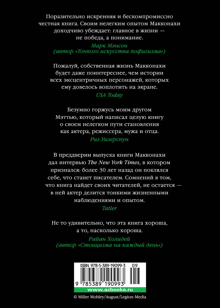 Впервые на русском - одно из главных книжных событий 2020 года, "Зеленый свет" знаменитого Мэттью Макконахи (лауреат "Оскара" за главную мужскую роль в фильме "Далласский клуб покупателей", Раст Коул в сериале "Настоящий детектив", Микки Пирсон в "Джентльменах" Гая Риччи) - отчасти иллюстрированная автобиография, отчасти учебник жизни. Став на рубеже веков звездой романтических комедий, Макконахи решил переломить судьбу и реализоваться как серьезный драматический актер. Он рассказывает о том, чего ему стоило это решение - и другие судьбоносные решения в его жизни: уехать после школы на год в Австралию, сменить юридический факультет на институт кинематографии, три года прожить на колесах, путешествуя от одной съемочной площадки к другой на автотрейлере в компании дворняги по кличке Мисс Хад, и главное - заслужить уважение отца … Итак, слово - автору: "Тридцать пять лет я осмысливал, вспоминал, распознавал, собирал и записывал то, что меня восхищало или помогало мне на жизненном пути. Как быть честным. Как избежать стресса. Как радоваться жизни. Как не обижать людей. Как не обижаться самому. Как быть хорошим. Как добиваться желаемого. Как обрести смысл жизни. Как быть собой".| Издательство | Азбука-Аттикус Издат.группа ООО |