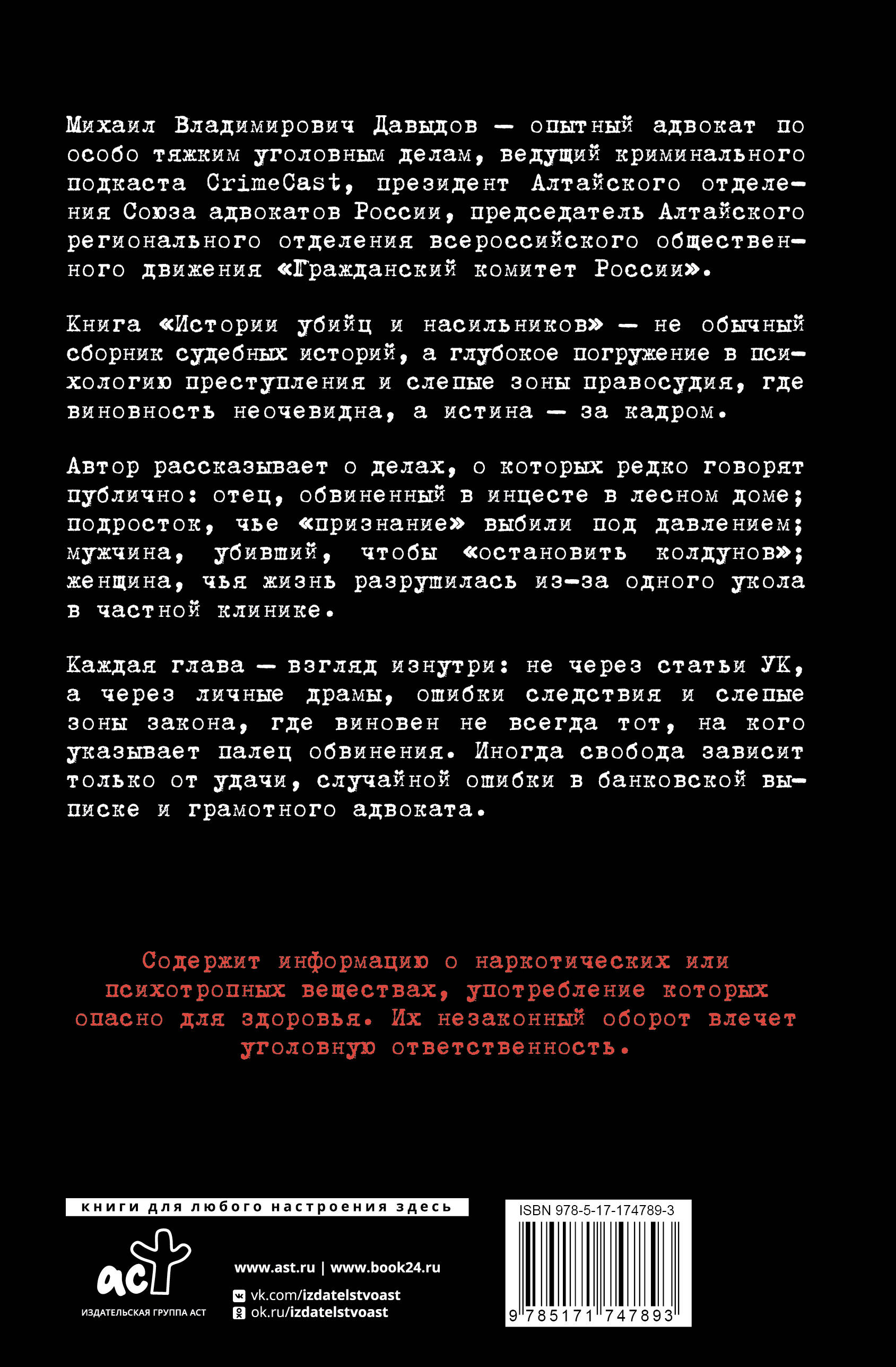 НЕЗАКОННОЕ ПОТРЕБЛЕНИЕ НАРКОТИЧЕСКИХ СРЕДСТВ, ПСИХОТРОПНЫХ ВЕЩЕСТВ, ИХ АНАЛОГОВ ПРИЧИНЯЕТ ВРЕД ЗДОРОВЬЮ, ИХ НЕЗАКОННЫЙ ОБОРОТ ЗАПРЕЩЕН И ВЛЕЧЕТ УСТАНОВЛЕННУЮ ЗАКОНОДАТЕЛЬСТВОМ ОТВЕТСТВЕННОСТЬ. Михаил Владимирович Давыдов - опытный адвокат по особо тяжким уголовным делам, ведущий криминального подкаста CrimeCast, Президент Алтайского отделения Союза Адвокатов России, Председатель Алтайского регионального отделения всероссийского общественного движения "Гражданский комитет России". Книга "Истории убийц и насильников" - не обычный сборник судебных историй, а глубокое погружение в психологию преступления и слепые зоны правосудия, где виновность неочевидна, а истина - за кадром. Автор рассказывает о делах, о которых редко говорят публично: отец, обвиненный в инцесте в лесном доме; подросток, чьё "признание" выбили давлением; мужчина, убивший, чтобы "остановить колдунов"; женщина, чья жизнь разрушилась из-за одного укола в частной клинике. Каждая глава - взгляд изнутри: не через статьи УК, а через личные драмы, ошибки следствия и слепые зоны закона. Иногда свобода зависит только от удачи, случайной ошибки в банковской выписке и грамотного адвоката.| Издательство | Издательство "АСТ" |