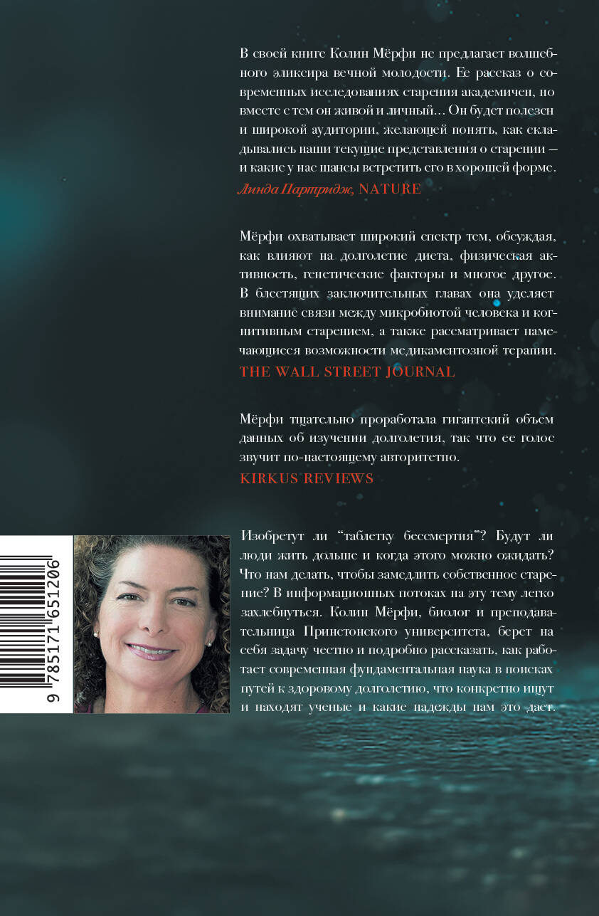 - От ведущей исследовательницы в области биологии старения. - Путеводитель по миру таинственных механизмов, управляющих продолжительностью жизни. - Редкий шанс заглянуть внутрь настоящей науки и узнать, как ученые ищут пути к долголетию. - В этой книге нет сомнительных рецептов вечной молодости, а есть лишь актуальные знания, которые способны улучшить нашу жизнь прямо сейчас. - Для поклонников творчества Сиддхартхи Мукерджи и Карла Циммера.| Издательство | Издательство "АСТ" |