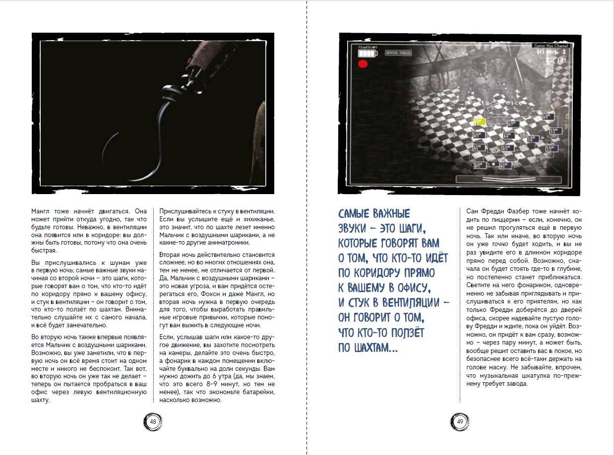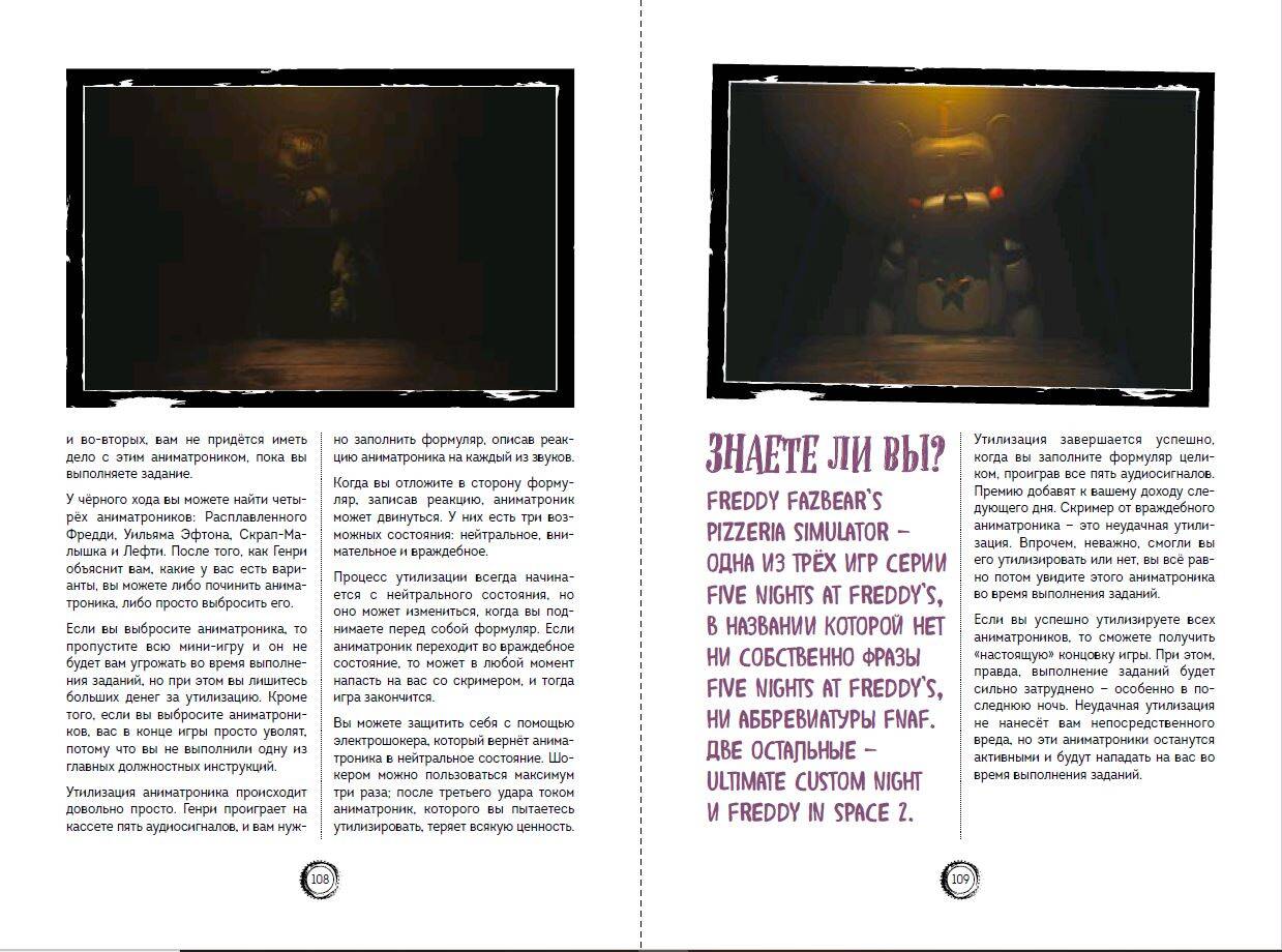 Новинка в серии-бестселлере «Пять ночей у Фредди»! Новый расширенный гайд по культовой Вселенной аниматроников! Внутри в стиле ФНАФ - мрачно, много черного цвета, местами пугающе! В этой книге: прохождение, особенности аниматроников, подсказки о том, как рисовать персонажей, как написать собственную страшную историю, примеры хоррор-игр, которые могут быть интересны геймерам. Чем отличается от других гайдов по ФНАФ: подойдет для начинающего игрока, фаната компьютерных игр и аниматроников. Всё подробно, простым языком, персонажи крупно. Отличная новинка к коллекции книг серии Five Nights at Freddy's!