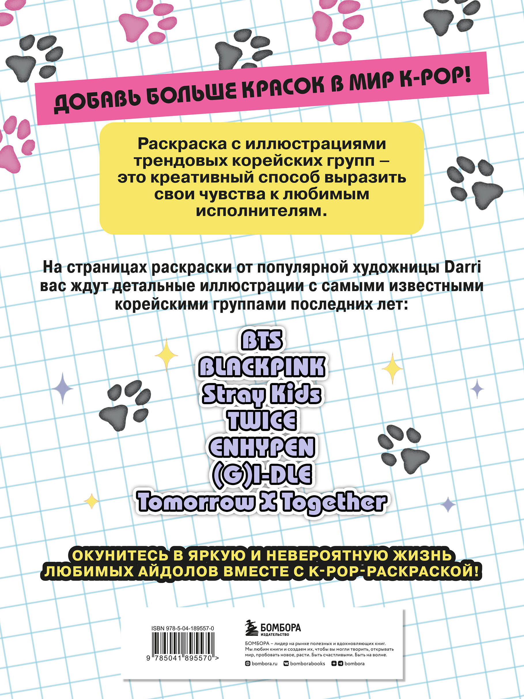Встречайте новую раскраску по самым популярным K-Pop исполнителям последнего десятилетия! Корейские айдол-коллективы уже не первый год покоряют сердца миллионов людей по всему миру, и их популярность с каждым годом лишь растет. Stray Kids, BLACKPINK, G-idle и многие другие участники крупных музыкальных лейблов ждут вас! На разворотах раскраски вы найдете 22 иллюстрации в авторском исполнении талантливой художницы Darii . Экспериментируйте, используйте самые смелые решения и раскрашивайте молодых исполнителей в своем уникальном стиле. Станьте ближе к любимым кумирам и погрузитесь в незабываемый мир K-Pop вместе с этой раскраской!| Издательство | ООО "Издательство "Эксмо" |