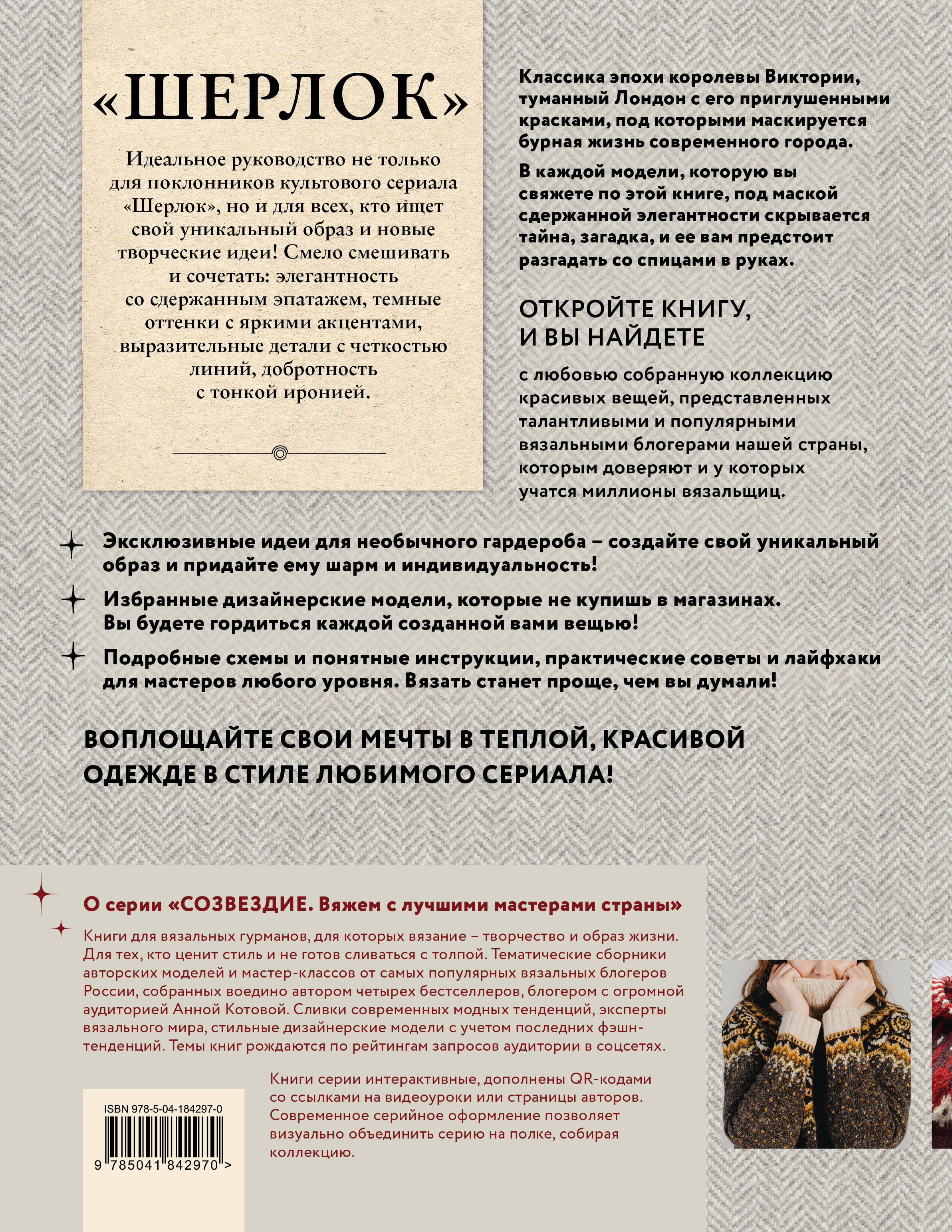 Уникальная книга в уникальной серии! Впервые авторские вязальные проекты от лучших мастеров России тщательно отобраны авторитетным экспертом, мастером, автором бестселлеров по вязанию Анной Котовой и представлены в одной книге! Самые авторитетные мастера-блогеры, чье имя знакомо любой вязальщице страны, по чьим мастер-классам обучаются вязать тысячи и тысячи учеников во всем мире, общая аудитория которых превышает полтора миллиона читателей, предоставили свои роскошные авторские модели в эту необычную книгу. В ней вы найдете избранные проекты, созданные в стиле неувядающей английской классики, и погрузитесь в столь полюбившуюся всем атмосферу культового сериала «ШЕРЛОК». Классика и сдержанность. Изысканность и строгость - мужская, женская, детская одежда на все времена! Вы и ваша семья достойны самого лучшего! Авторский коллектив: НАТЕЛА АСТАХОВА ЕЛИЗАВЕТА ВИШНЯКОВА ЕЛЕНА ГРАБЕНКО ЮЛИЯ ЕГОРОВА КСЕНИЯ КОМИССАРОВА ЕКАТЕРИНА ОГАНЕСЯН ТАТЬЯНА ОДИНЦОВА ЕКАТЕРИНА ОЛБУТ ИРИНА ПЕЧЕНЕВСКАЯ АНАСТАСИЯ РОМАНОВА ЕКАТЕРИНА СТЕПАНОВА ТАТЬЯНА УЛУДЖЕВИЗ ЮЛИЯ УСТИНОВА О серии «СОЗВЕЗДИЕ. Вяжем с лучшими мастерами страны» Книги для вязальных гурманов, для которых вязание - творчество и образ жизни. Для тех, кто ценит стиль и не готов сливаться с толпой. Тематические сборники авторских моделей и мастер-классов от самых популярных вязальных блогеров России, собранных воедино автором четырех бестселлеров, блогером с огромной аудиторией и множеством учеников Анной Котовой. Сливки современных модных тенденций, эксперты вязального мира, стильные дизайнерские модели с учетом последних фэшн-тенденций. Темы книг рождаются по рейтингам запросов аудитории в соцсетях. Книги серии интерактивные, дополнены QR-кодами со ссылками на видеоуроки или страницы авторов, обеспечивая обратную связь с читателем. Современное серийное оформление с возможностью визуально объединить серию на полке, собирая коллекцию.| Издательство | ООО "Издательство "Эксмо" |
