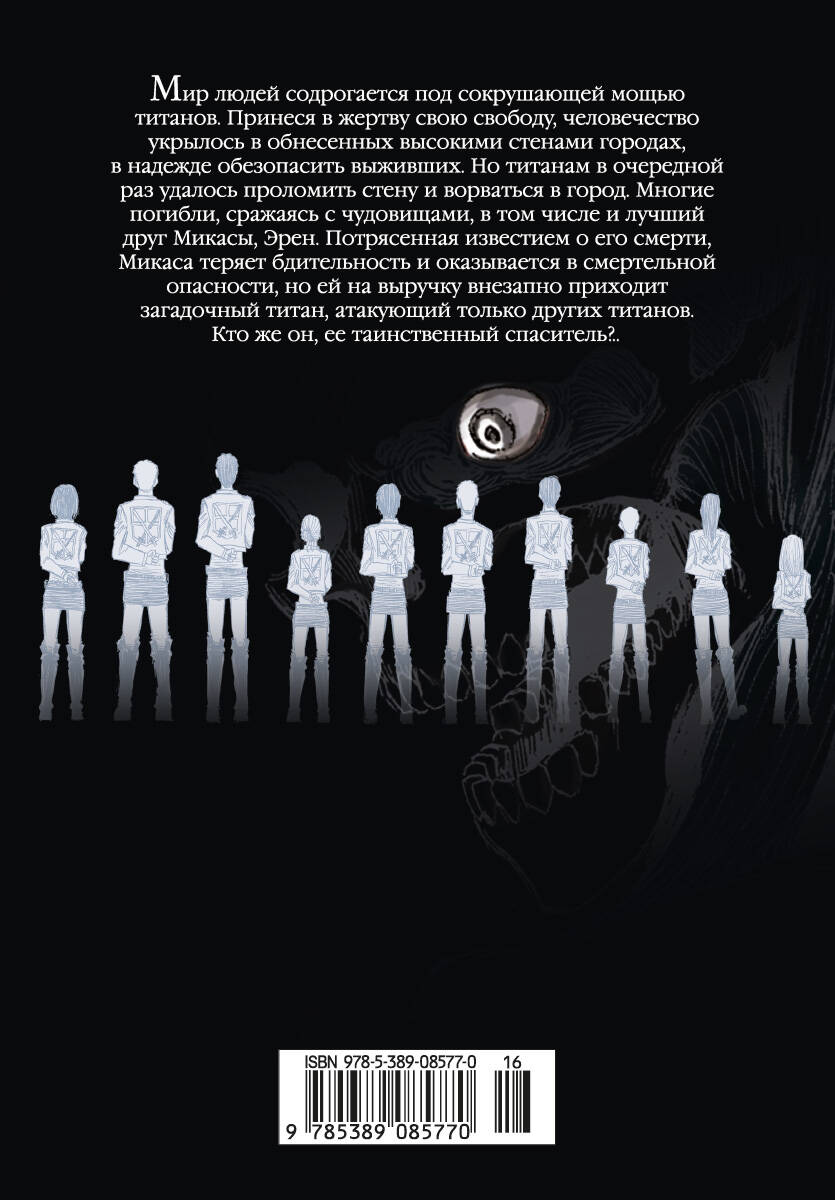 Мир людей содрогается под сокрущающей мощью Титанов. Принеся в жертву свою свободу, человечество укрылось в обнесенных высокими стенами городах, в надежде обезопасить выживших. Но Титанам в очередной раз удалось проломить стену и ворваться в город. Многие погибли, сражаясь с чудовищами, в том числе и лучший друг Микасы, Эрен. Потрясенная известием о его смерти, Микаса теряет бдительность и оказывается в смертельной опасности, но ей на выручку внезапно приходит загадочный титан, атакующий только других титанов. Кто же он, ее таинственный спаситель?..| Издательство | Азбука-Аттикус Издат.группа ООО |