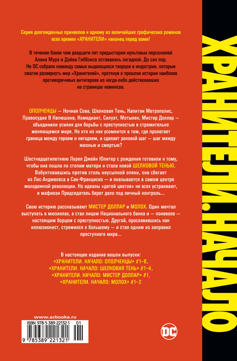 Серия долгожданных приквелов к одному из величайших графических романов всех времен "ХРАНИТЕЛИ" наконец перед вами! Почти тридцать лет предыстория культовых персонажей Алана Мура и Дэйва Гиббонса оставалась загадкой. До сих пор. Но DC собрала команду самых выдающихся творцов в индустрии, которые смогли развернуть мир Хранителей, протянув в прошлое истории наиболее противоречивых антигероев из когда-либо действовавших на страницах комиксов.| Издательство | Азбука-Аттикус Издат.группа ООО |