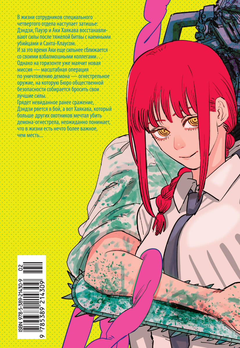 В жизни сотрудников специального четвертого отдела наступает затишье: Дэндзи, Пауэр и Аки Хаякава восстанавливают силы после тяжелой битвы с наемными убийцами и Санта-Клаусом. И за это время Аки еще сильнее сближается со своими взбалмошными коллегами… Однако на горизонте уже маячит новая миссия - масштабная операция по уничтожению демона - огнестрельное оружие, на которую Бюро общественной безопасности собирается бросить свои лучшие силы. Грядет невиданное ранее сражение, Дэндзи рвется в бой, а вот Хаякава, который больше других охотников мечтал убить демона-огнестрела, неожиданно понимает, что в жизни есть нечто более важное, чем месть. В пятую книгу вошли тома 9 и 10 ("Купание в ванне" и "Чувства собаки"), что соответствует главам с 71-й по 88-ю. В издании двусторонняя суперобложка.| Издательство | Азбука-Аттикус Издат.группа ООО |