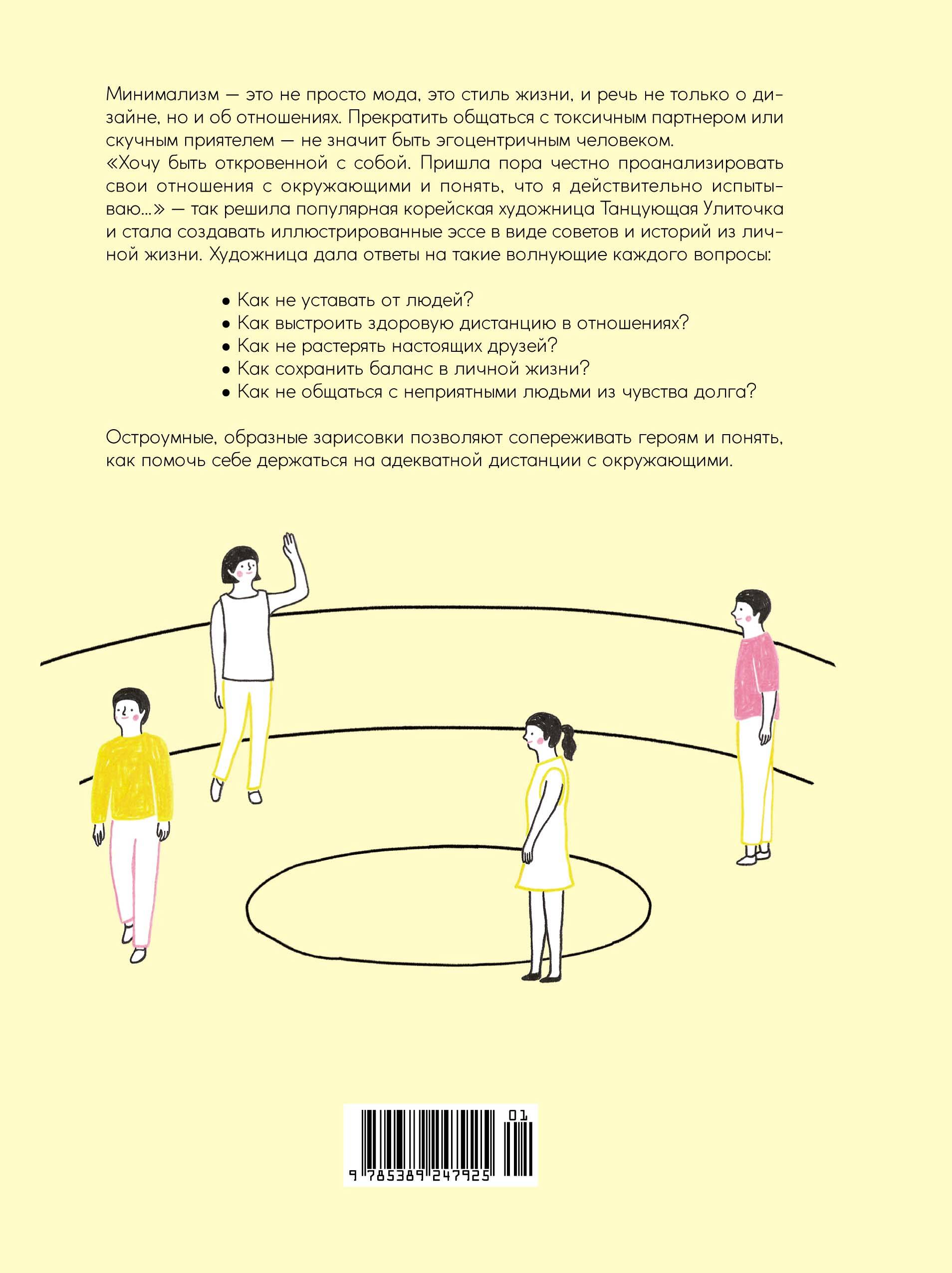 Минимализм - это не просто мода, это стиль жизни, и речь не только о дизайне, но и об отношениях. Прекратить общаться с токсичным партнером или скучным приятелем - не значит быть эгоцентричным человеком. "Хочу быть откровенной с собой. Пришла пора честно проанализировать свои отношения с окружающими и понять, что я действительно испытываю…" - так решила популярная корейская художница Танцующая Улиточка и стала создавать иллюстрированные эссе в виде советов и историй из личной жизни. Художница дала ответы на такие волнующие каждого вопросы: как не уставать от людей, как выстроить здоровую дистанцию в отношениях, как не растерять настоящих друзей, как сохранить баланс в личной жизни, как не общаться с неприятными людьми из чувства долга. Остроумные, образные зарисовки позволяют сопереживать героям и понять, как помочь себе держаться на адекватной дистанции с окружающими.| Издательство | Азбука-Аттикус Издат.группа ООО |