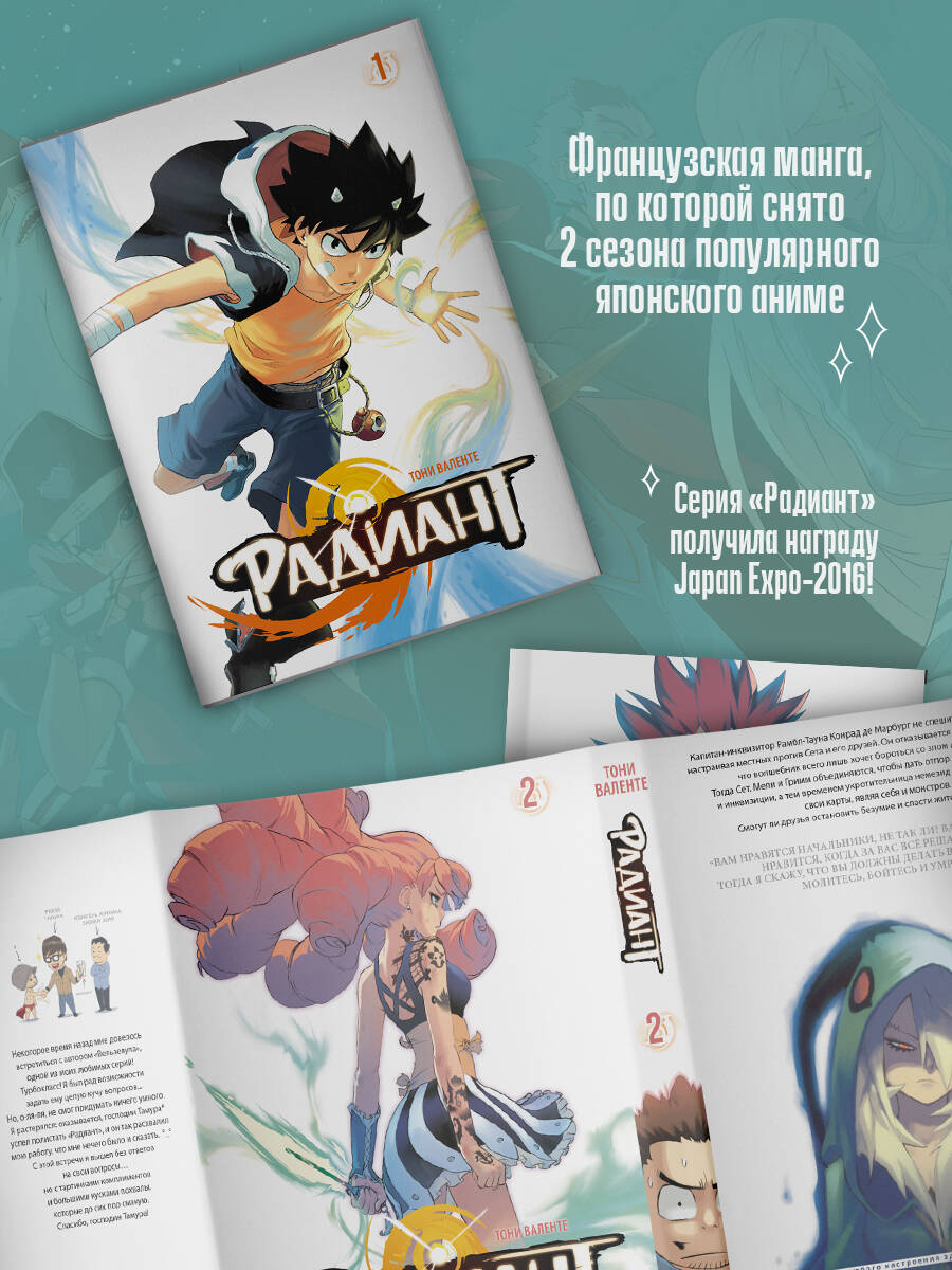 • Для поклонников «Наруто», «One piece», «Магическая битва». • Популярная французская манга, написанная и проиллюстрированная французским художником и сценаристом Тони Валенте. • По манге снято 2 сезона популярного японского аниме! • Серия получила награду Japan Expo! • РЕДАКЦИЯ 2Х2.МЕДИА: «Второй том «Радианта» приумножает все достоинства первой книги: больше юмора, причудливого мира колдунов и их особенностей, больше тайных заговоров инквизиции и, конечно, экшена и сражений!».