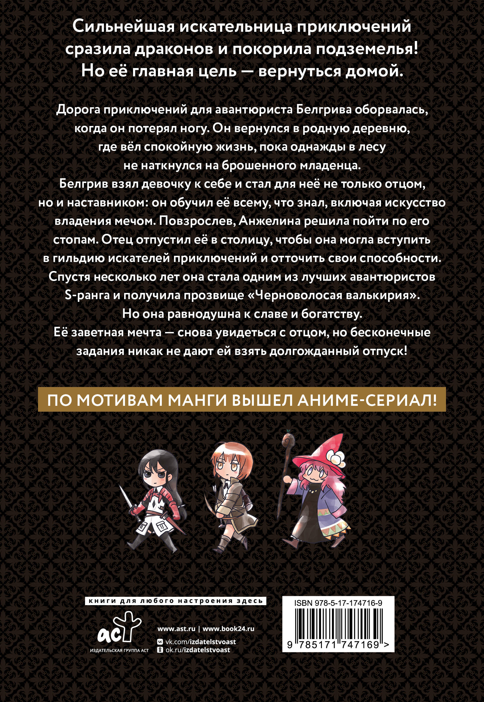Дорога приключений для авантюриста Белгрива оборвалась, когда он потерял ногу. Он вернулся в родную деревню, где вёл спокойную жизнь, пока однажды в лесу не наткнулся на брошенного младенца. Белгрив взял девочку к себе и стал для неё не только отцом, но и наставником: он обучил её всему, что знал, включая искусство владения мечом. Повзрослев, Анжелина решила пойти по его стопам. Отец отпустил её в столицу, чтобы она могла вступить в гильдию искателей приключений и отточить свои способности. Спустя несколько лет она стала одним из лучших авантюристов S-ранга и получила прозвище "Черноволосая валькирия". Но она равнодушна к славе и богатству. Её заветная мечта - снова увидеться с отцом, но бесконечные задания никак не дают ей взять долгожданный отпуск!| Издательство | Издательство "АСТ" |