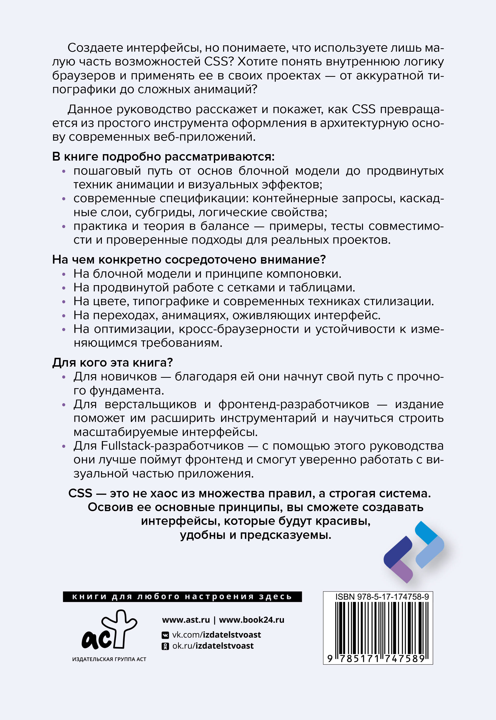 Перед вами практическое руководство по современным техникам веб-стилизации, в котором язык CSSраскрывается как инструмент точной настройки визуальной среды - от фундаментальных принципов до самых продвинутых возможностей. Книга охватывает весь путь освоения CSS: от блочной модели - основы компоновки элементов на странице - до сложных анимаций, эффектов и приемов, позволяющих создавать выразительные и в то же время производительный интерфейс. В отдельных главах рассматриваются современные подходы к сеткам и табличной верстке, работа с цветом, типографикой и переходами. Особое внимание уделено архитектурным аспектам: управлению специфичностью и слоями, поддержке адаптивности с помощью контейнерных запросов, применению субгридов и логических свойств. Все это сопровождается практическими примерами и стратегиями оптимизациями, что делает книгу полезной как для проектирования модульных компонентов, так и для масштабных систем. "Магия CSS" предназначена для широкого круга специалистов - и для тех, кто только начинает знакомство с веб-стилизацией, и для опытных разработчиков, стремящихся углубить свои знания и использовать CSS на профессиональном уровне.| Издательство | Издательство "АСТ" |