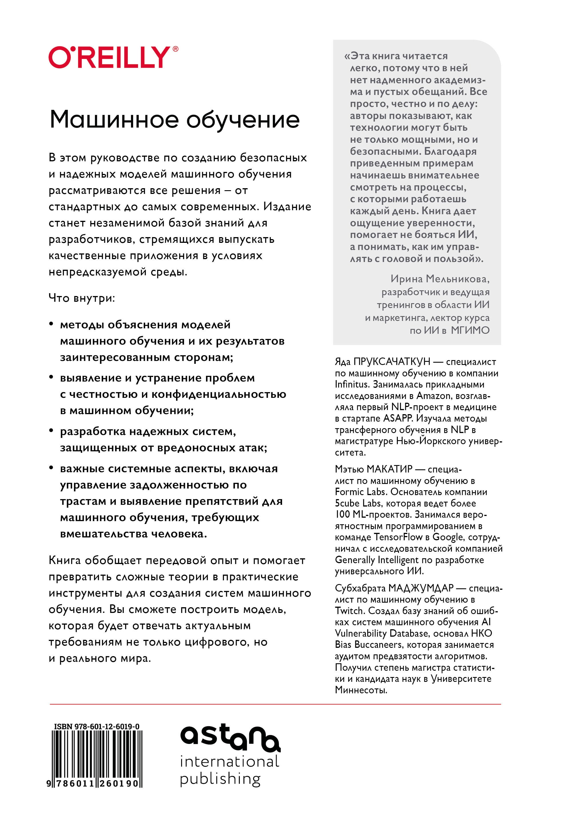 «Машинное обучение. Как построить надежные модели искусственного интеллекта» В этом руководстве по созданию безопасных и надежных моделей машинного обучения рассматриваются все решения - от стандартных до самых современных. Издание станет незаменимой базой знаний для разработчиков, стремящихся выпускать качественные приложения в условиях непредсказуемой среды. Что внутри: * методы объяснения моделей машинного обучения и их результатов заинтересованным сторонам; * выявление и устранение проблем с честностью и конфиденциальностью в машинном обучении; * разработка надежных систем, защищенных от вредоносных атак; * важные системные аспекты, включая управление задолженностью по трастам и выявление препятствий для машинного обучения, требующих вмешательства человека. Книга обобщает передовой опыт и помогает превратить сложные теории в практические инструменты для создания систем машинного обучения. Вы сможете построить модель, которая будет отвечать актуальным требованиям не только цифрового, но и реального мира. Об авторах Яда ПРУКСАЧАТКУН - специалист по машинному обучению в компании Infinitus. Занималась прикладными исследованиями в Amazon, возглавляла первый NLP-проект в медицине в стартапе ASAPP. Изучала методы трансферного обучения в NLP в магистратуре Нью-Йоркского университета. Мэтью МАКАТИР - специалист по машинному обучению в Formic Labs. Основатель компании 5cube Labs, которая ведет более 100 ML-проектов. Занимался вероятностным программированием в команде TensorFlow в Google, сотрудничал с исследовательской компанией Generally Intelligent по разработке универсального ИИ. Субхабрата МАДЖУМДАР - специалист по машинному обучению в Twitch. Создал базу знаний об ошибках систем машинного обучения AI Vulnerability Database, основал НКО Bias Buccaneers, которая занимается аудитом предвзятости алгоритмов. Получил степень магистра статистики и кандидата наук в Университете Миннесоты. Отзыв «Эта книга читается легко, потому что в ней нет надменного академизма и пустых обещаний. Все просто, честно и по делу: авторы показывают, как технологии могут быть не только мощными, но и безопасными. Благодаря приведенным примерам начинаешь внимательнее смотреть на процессы, с которыми работаешь каждый день. Книга дает ощущение уверенности, помогает не бояться ИИ, а понимать, как им управлять с головой и пользой». - Ирина Мельникова, разработчик и ведущая тренингов в области ИИ и маркетинга, лектор курса по ИИ в МГИМО| Издательство | Астана иностранная пресса ТОО |