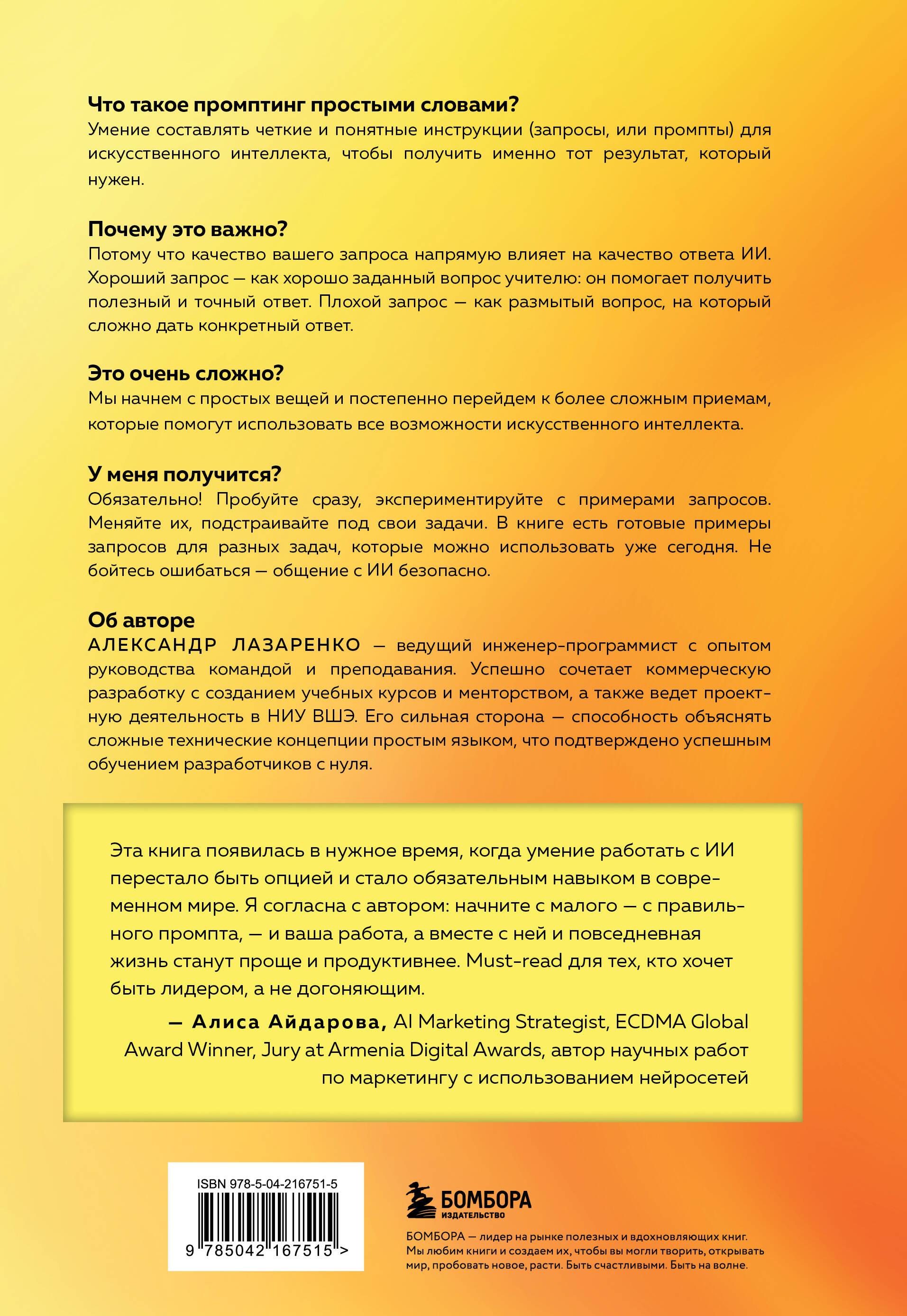 Что такое промптинг простыми словами? Умение составлять четкие и понятные инструкции (запросы или промпты) для искусственного интеллекта, чтобы получить именно тот результат, который нужен. Почему это важно? Потому что качество вашего запроса напрямую влияет на качество ответа ИИ. Хороший запрос - как хорошо заданный вопрос учителю: он помогает получить полезный и точный ответ. Плохой запрос - как размытый вопрос, на который сложно дать конкретный ответ. Это очень сложно? Мы начнем с простых вещей и постепенно перейдем к более сложным приемам, которые помогут использовать все возможности искусственного интеллекта. У меня получится? Обязательно! Пробуйте сразу, экспериментируйте с примерами запросов. Меняйте их, подстраивайте под свои задачи. В книге есть готовые примеры запросов для разных задач, которые можно использовать уже сегодня. Не бойтесь ошибаться - общение с ИИ безопасно. Об авторе Александр ЛАЗАРЕНКО - ведущий инженер-программист с опытом руководства командой и преподавания. Успешно сочетает коммерческую разработку с созданием учебных курсов и менторством, а также ведет проектную деятельность в НИУ ВШЭ. Его сильная сторона - способность объяснять сложные технические концепции простым языком, что подтверждено успешным обучением разработчиков с нуля. «Эта книга появилась в нужное время, когда умение работать с ИИ перестало быть опцией и стало обязательным навыком в современном мире. Я согласна с автором: начните с малого - с правильного промпта - и ваша работа, а вместе с ней и повседневная жизнь, станут проще и продуктивнее. Must-read для тех, кто хочет быть лидером, а не догоняющим». - Алиса Айдарова, AI Marketing Strategist, ECDMA Global Award Winner, Jury at Armenia Digital Awards, автор научных работ по маркетингу с использованием нейросетей| Издательство | ООО "Издательство "Эксмо" |