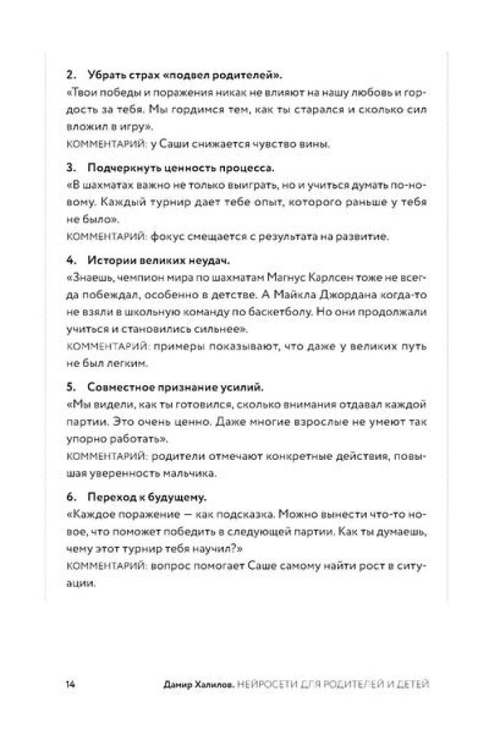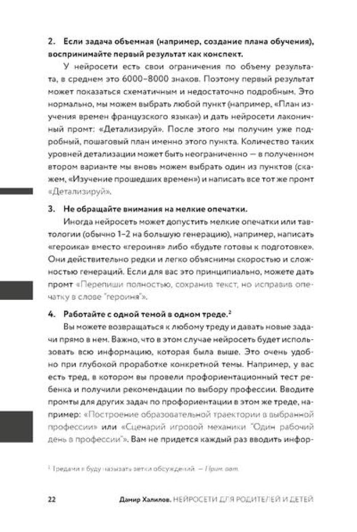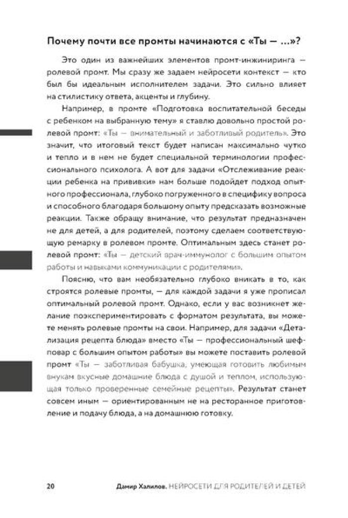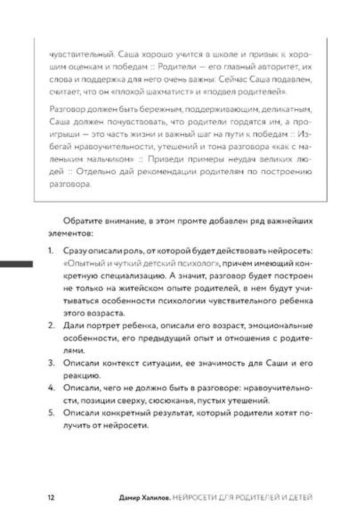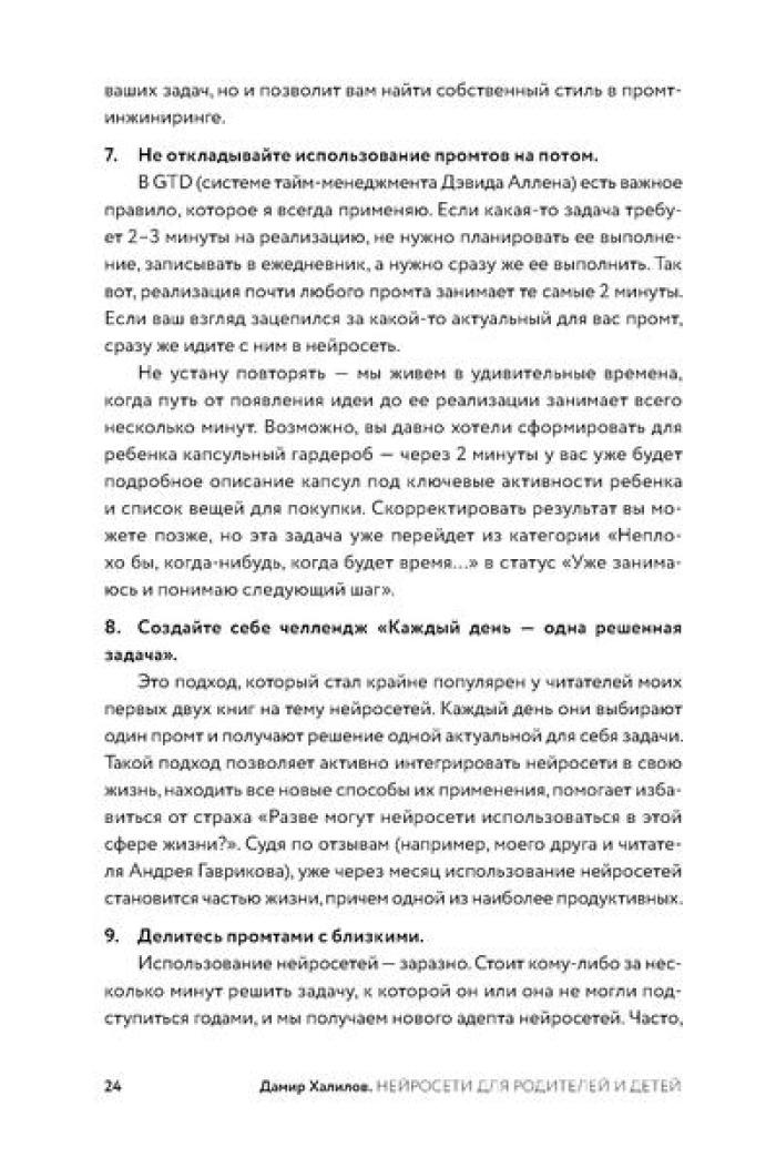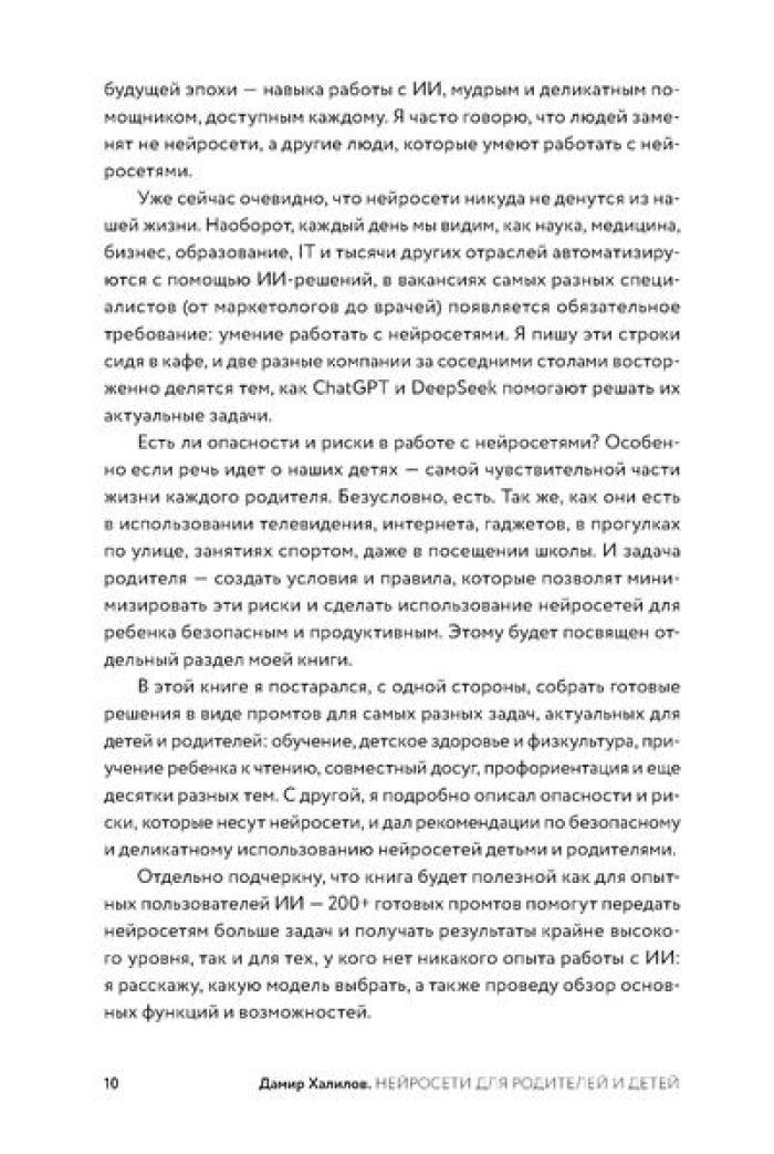 Дамир Халилов, один из первых в России экспертов по нейросетям, создал практический инструмент для родителей - 204 готовых промта, разработанных по его собственной методике. Автор подробно описывает, как освоить безопасное использование ИИ-инструментов и адаптировать промты под специфику семьи. Книга поможет сэкономить десятки часов на подготовке к экзаменам, организации досуга, распределении домашних обязанностей и решении сложных воспитательных вопросов.| Издательство | Альпина Паблишер |