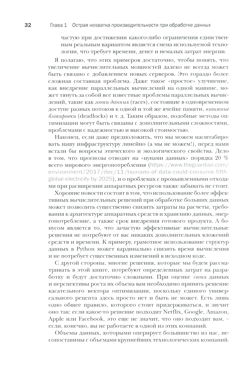 Данная книга предлагает уникальные техники ускорения выполнения кода на Python с акцентом на большие данные. Вы узнаете, как оптимизировать работу со встроенными структурами данных за счет конкурентного выполнения, а также научитесь сокращать объем занимаемой данными памяти без ущерба для их точности. Ознакомившись с тщательно проработанными примерами, вы узнаете, как добиться большей производительности популярных библиотек, таких как NumPy и pandas, и как эффективно обрабатывать и хранить данные. В книге используется целостный подход к повышению эффективности решений, так что вы научитесь оптимизировать и масштабировать целые системы - начиная от кода и заканчивая архитектурой. Издание предназначено для разработчиков Python, знакомых с основами языка и принципами конкурентных вычислений.| Издательство | ДМК |