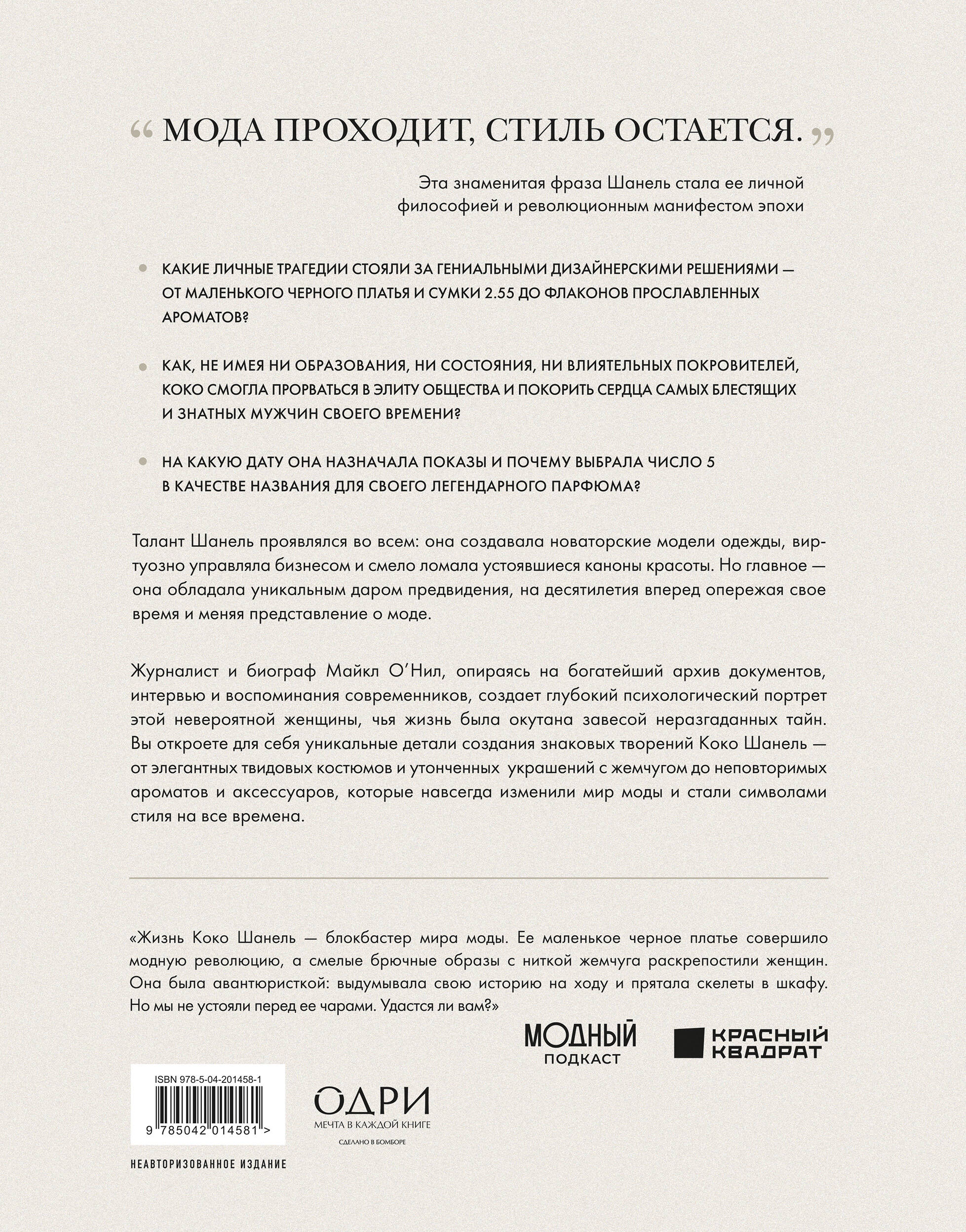 «Мода проходит, стиль остаётся» - эта фраза Коко Шанель стала не просто афоризмом, а манифестом целой эпохи. Как девочка из провинциальной глубинки сумела покорить Париж и создать модную империю без поддержки, образования и богатства? Как личные трагедии, страстная любовь и одиночество стали топливом для идей, которые навсегда изменили представление о женственности? Эта книга - не просто биография, а глубокий психологический портрет женщины, которая превратила свою жизнь в легенду и сделала моду и стиль формой высказывания. Перед вами - история о таланте и невероятной силе характера. На основе архивов, писем и редких интервью автор книги Майкл О'Нил воссоздает живой образ великой Мадемуазель - дерзкой, независимой, непредсказуемой. Вы откройте для себя уникальные детали создания знаковых творений Коко Шанель - от элегантных твидовых костюмов и утонченных украшений с жемчугом до неповторимых ароматов и аксессуаров, которые навсегда изменили мир моды и стали символами стиля на все времена. Мелованная бумага, редкие иллюстрации, стильная обложка, подарочное издание, эксклюзивные подробности создания культовых символов дома Chanel. Книга будет интересна всем, кто увлекается историей, интересуется миром моды и красоты.