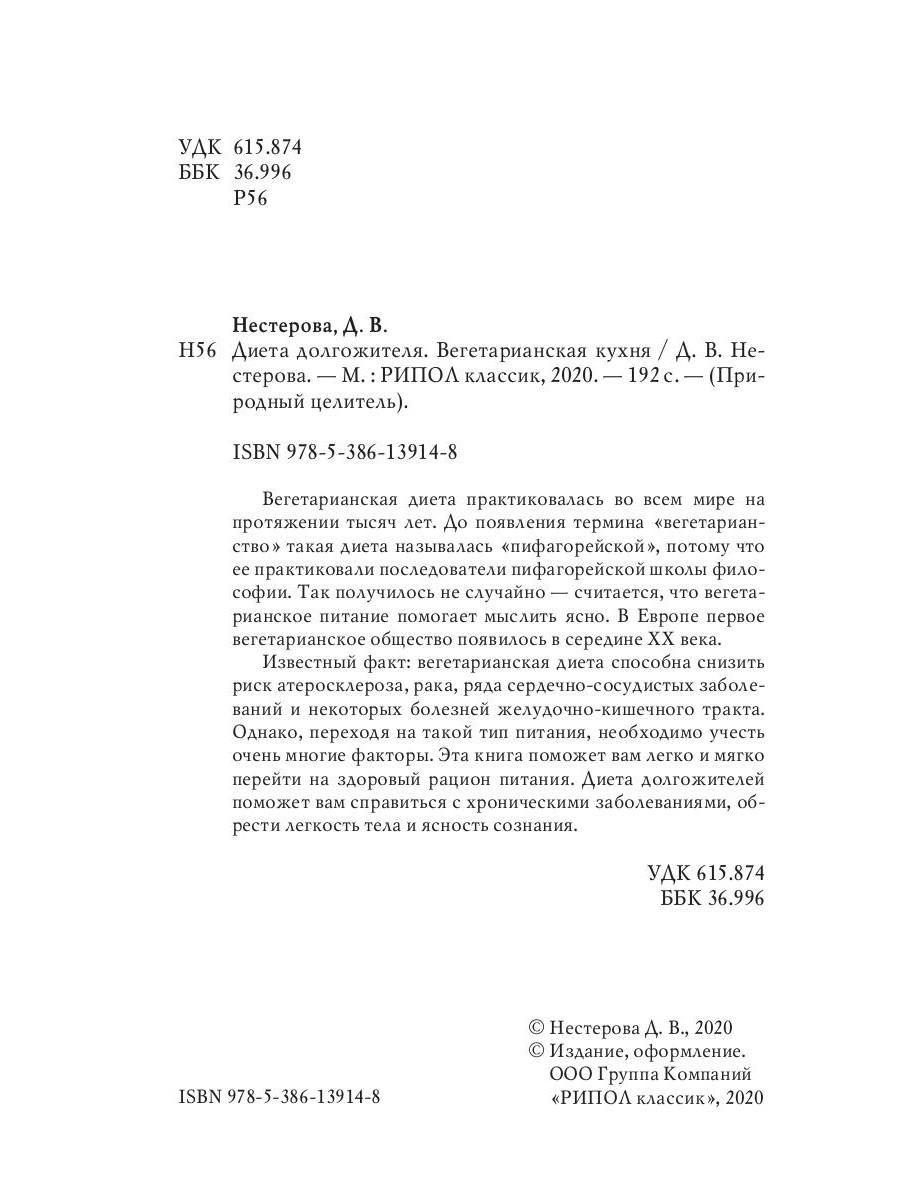Вегетарианская диета практиковалась во всем мире на протяжении тысяч лет. До появления термина «вегетарианство» такая диета называлась «пифагорейской», потому что ее практиковали последователи пифагорейской школы философии. Так получилось не случайно - считается, что вегетарианское питание помогает мыслить ясно. В Европе первое вегетарианское общество появилось в середине XX века. Известный факт: вегетарианская диета способна снизить риск атеросклероза, рака, ряда сердечно-сосудистых заболеваний и некоторых болезней желудочно-кишечного тракта. Однако, переходя на такой тип питания, необходимо учесть очень многие факторы. Эта книга поможет вам легко и мягко перейти на здоровый рацион питания. Диета долгожителей поможет вам справиться с хроническими заболеваниями, обрести легкость тела и ясность сознания.| Издательство | Рипол Классик |