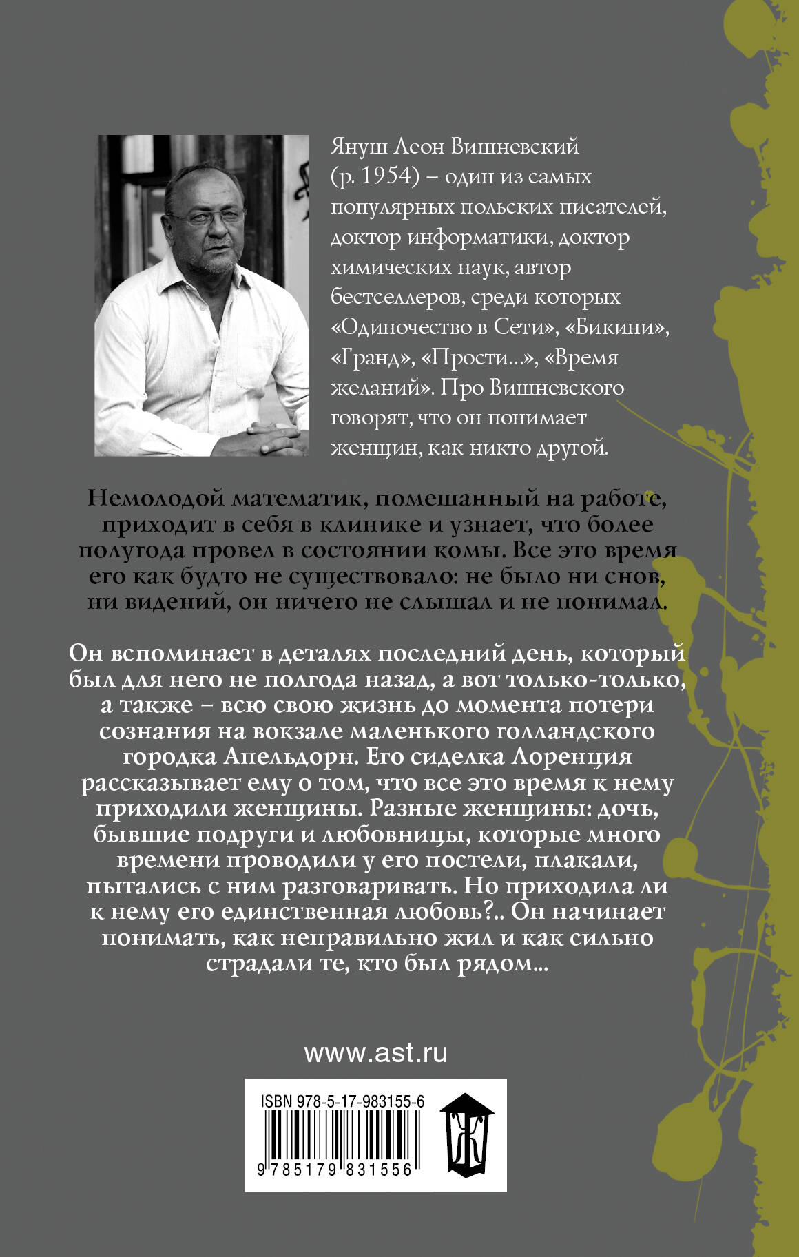 Немолодой математик, помешанный на работе, приходит в себя в клинике и узнает, что более полугода провел в состоянии комы. Все это время его как будто не существовало: не было ни снов, ни видений, он ничего не слышал и не понимал. Он вспоминает в деталях последний день, который был для него не полгода назад, а вот только-только, а также - всю свою жизнь до момента потери сознания на вокзале маленького голландского городка Апельдорн. Его сиделка Лоренция рассказывает ему о том, что все это время к нему приходили женщины. Разные женщины: дочь, бывшие подруги и любовницы, которые много времени проводили у его постели, плакали, пытались с ним разговаривать. Но приходила ли к нему его единственная любовь?.. Он начинает понимать, как неправильно жил и как сильно страдали те, кто был рядом...| Издательство | ИЗДАТЕЛЬСТВО "АСТ" |