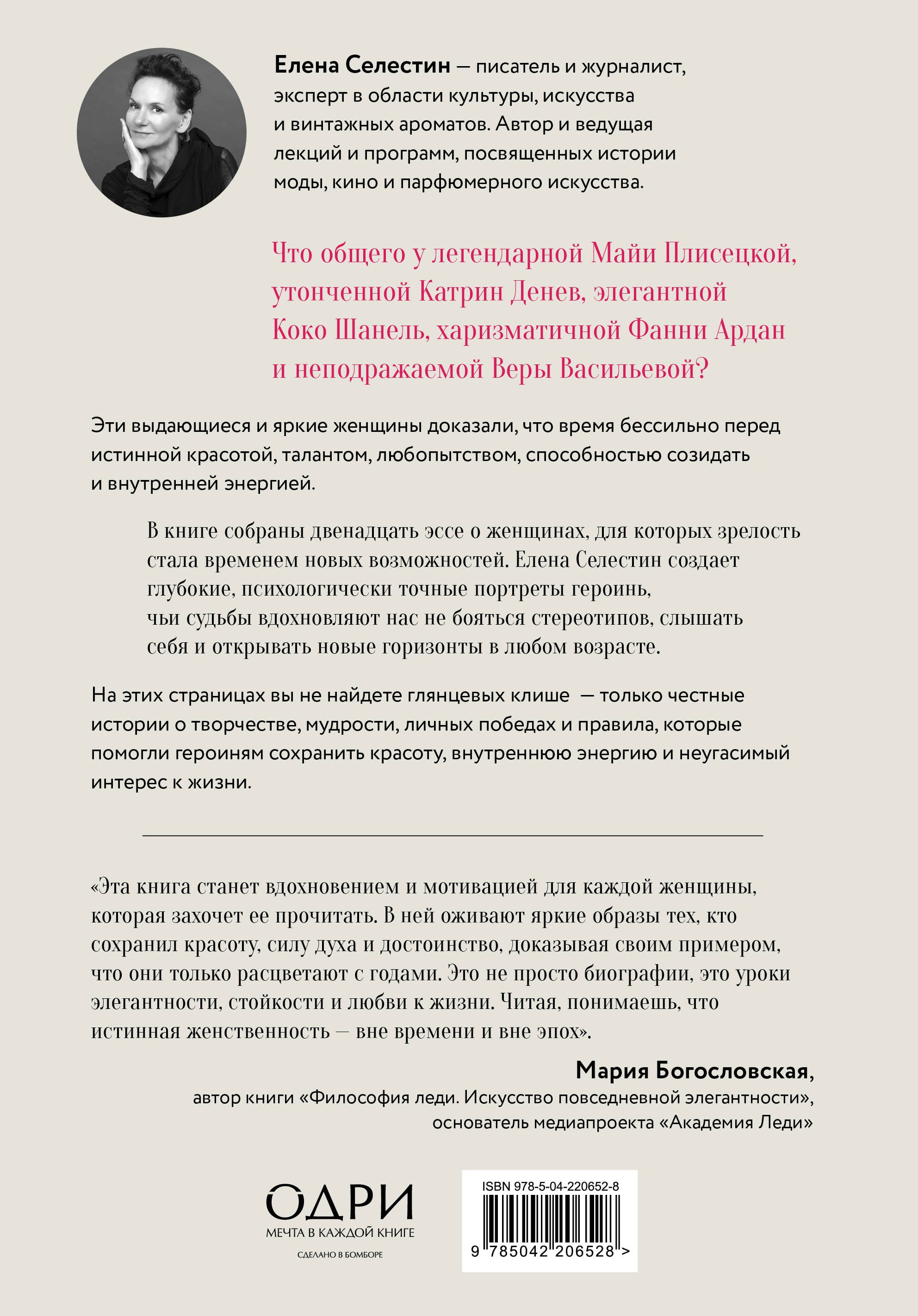 Что общего у легендарной Майи Плисецкой, утонченной Катрин Денёв, элегантной Коко Шанель, харизматичной Фанни Ардан и неподражаемой Веры Васильевой? Эти выдающиеся женщины доказали, что время бессильно перед истинной красотой, талантом, способностью любить и внутренней энергией! Писатель и искусствовед Елена Селестин создаёт глубокие, психологически точные портреты героинь, чьи судьбы вдохновляют нас не бояться стереотипов, слышать себя и открывать новые горизонты в любом возрасте. В книге собрано двенадцать эссе о женщинах, для которых зрелость стала временем новых возможностей. На этих страницах вы не найдете глянцевых клише - только честные и сильные истории о творчестве, мудрости и личных победах. Перед вами прекрасно оформленное подарочное издание о 12 великих женщинах: Фанни Ардан, Майе Плисецкой, Габриэль Шанель, Джейн Фонде, Кэтрин Хэпберн, Софи Лорен, Вере Васильевой, Агате Кристи, Вивьен Вествуд, Елизавете II, Вере Вонг и Катрин Денёв. В книге - их уникальные фотографии в разные годы, а также правила жизни каждой из героинь, которые помогли им сохранить жизненную энергию и неугасимый интерес к жизни. - Фанни Ардан, интеллектуалка с дипломом политолога и страстная поклонница русской литературы, поддерживает остроту ума и свежесть памяти, разучивая новые этюды на фортепиано. - Вера Васильева даже после восьмидесяти продолжала выходить на сцену, с энтузиазмом примеряла новые образы и работала с прежней творческой страстью. - Катрин Денёв следует мудрым советам матери, которая дожила до 110 лет: достаточно спать, беречься от солнца и пить много воды. - Агата Кристи находила радость в садоводстве и достигла в этом деле таких высот, что получала призы за свои великолепные камелии. - Коко Шанель была аскетом в еде и могла довольствоваться скромным ужином, ограничиваясь лишь тарелкой чечевицы. 12 женщин - 12 историй успеха, вдохновения и любви к жизни. Эта книга-манифест убеждает в том, что время лишь приумножает внутреннюю свободу, силу и талант.| Издательство | ООО "Издательство "Эксмо" |
