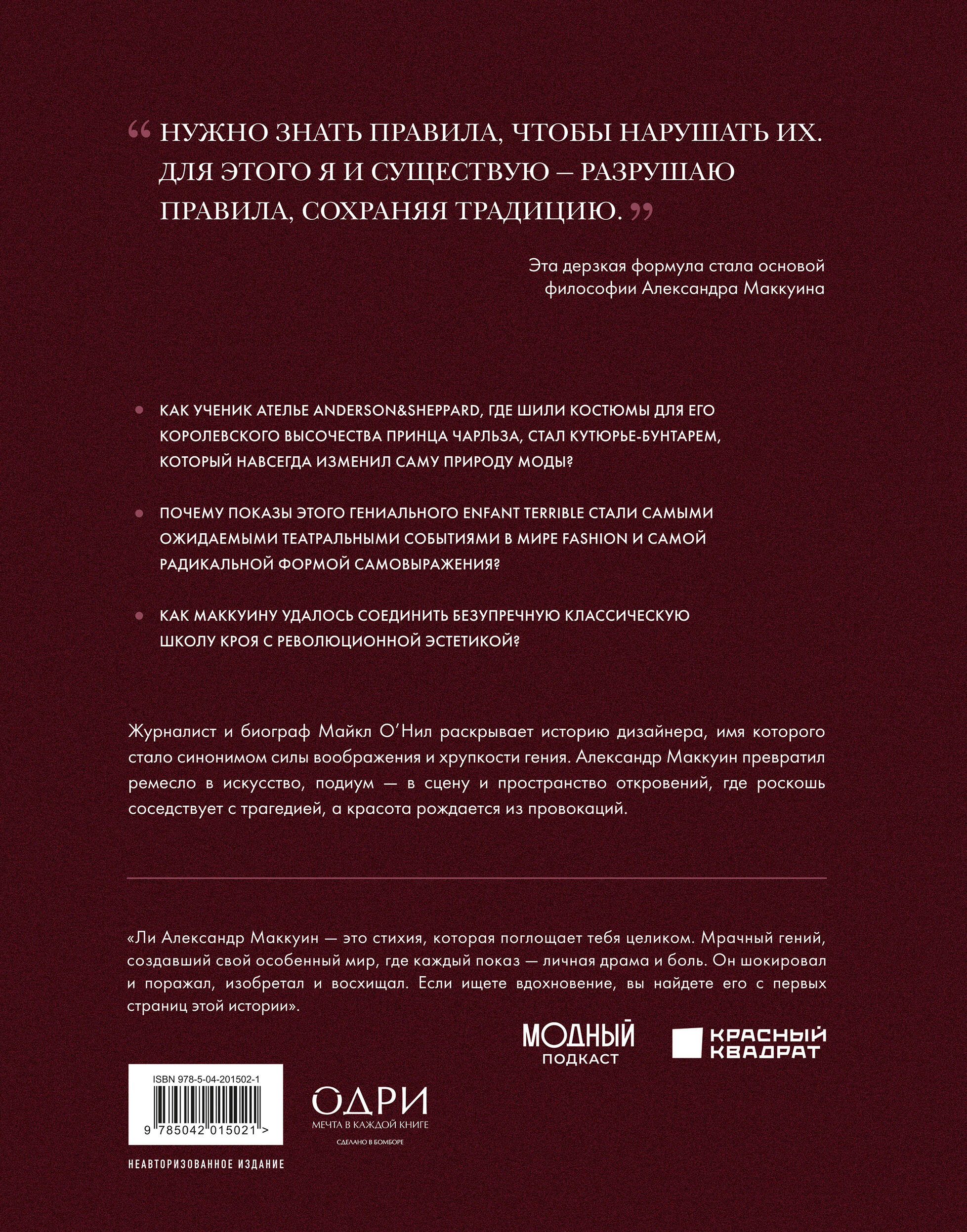 Александр Маккуин был революционером визуального языка моды. Автор книги Майкл О'Нил поднимает завесу над малоизвестными этапами жизни творца, показывая, как юноша из скромной лондонской семьи превратился в культовую фигуру fashion-мира, чья карьера была полна драм, скандалов, взлетов и падений. Редкие архивные фотографии, эскизы и закулисные кадры раскрывают путь мастера, для которого мода стала формой исповеди и искусства на грани. Это книга о страстях, одиночестве, вдохновении и свободе - о том, как один человек сумел превратить шок в красоту и оставить след в модном пантеоне, который не сотрет время. Большой формат, мелованная бумага, редкие иллюстрации, архивные документы, стильная обложка, подарочное издание. Увлекательная хроника жизни Александра Маккуина, ранее неизвестные страницы биографии бунтаря моды. Вы узнаете: - как ученик ателье Anderson&Sheppard, где шили костюмы для его королевского высочества принца Чарльза, стал кутюрье-бунтарем, который навсегда изменил саму природу моды; - почему показы этого гениального enfant terrible стали самыми ожидаемыми театральными событиями в мире моды и самой радикальной формой самовыражения; - как Маккуину удалось соединить безупречную классическую школу кроя с революционной эстетикой.