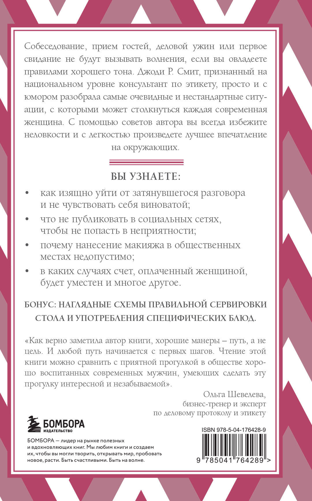 Собеседование, прием гостей, деловой ужин или первое свидание не будут вызывать волнения, если вы овладеете правилами хороших тона. Джоди Р. Смит, признанный на национальном уровне консультант по этикету, просто и с юмором разобрала самые очевидные и нестандартные ситуации, с которыми может столкнуться каждая современная женщина. С помощью советов автора вы всегда избежите неловкости и с легкостью произведете лучшее впечатление на окружающих. Вы узнаете: • как изящно уйти от затянувшегося разговора и не чувствовать себя виноватой; • что не публиковать в социальных сетях, чтобы не попасть в неприятности; • почему нанесение макияжа в общественных местах недопустимо; • в каких случаях счет, оплаченный женщиной, будет уместен, и многое другое. Бонус: наглядные схемы правильной сервировки стола и употребления специфических блюд. «Как верно заметила автор книги, хорошие манеры - путь, а не цель. И любой путь начинается с первых шагов. Чтение этой книги можно сравнить с приятной прогулкой в обществе хорошо воспитанных современных мужчин, умеющих сделать эту прогулку интересной и незабываемой». - Ольга Шевелева, бизнес-тренер и эксперт по деловому протоколу и этикету| Издательство | ООО "Издательство "Эксмо" |