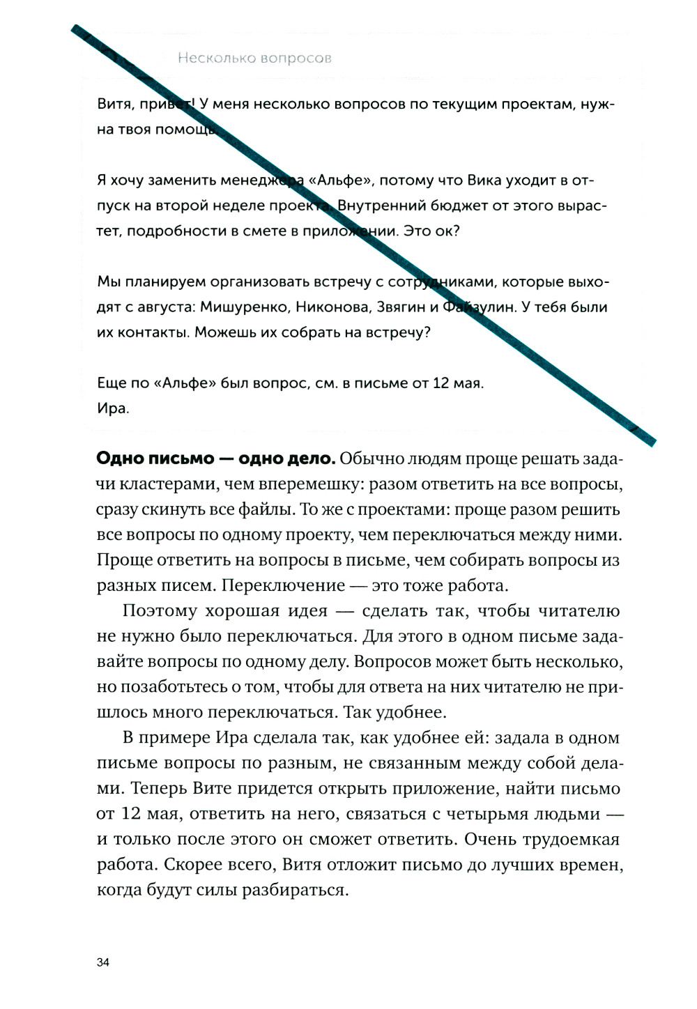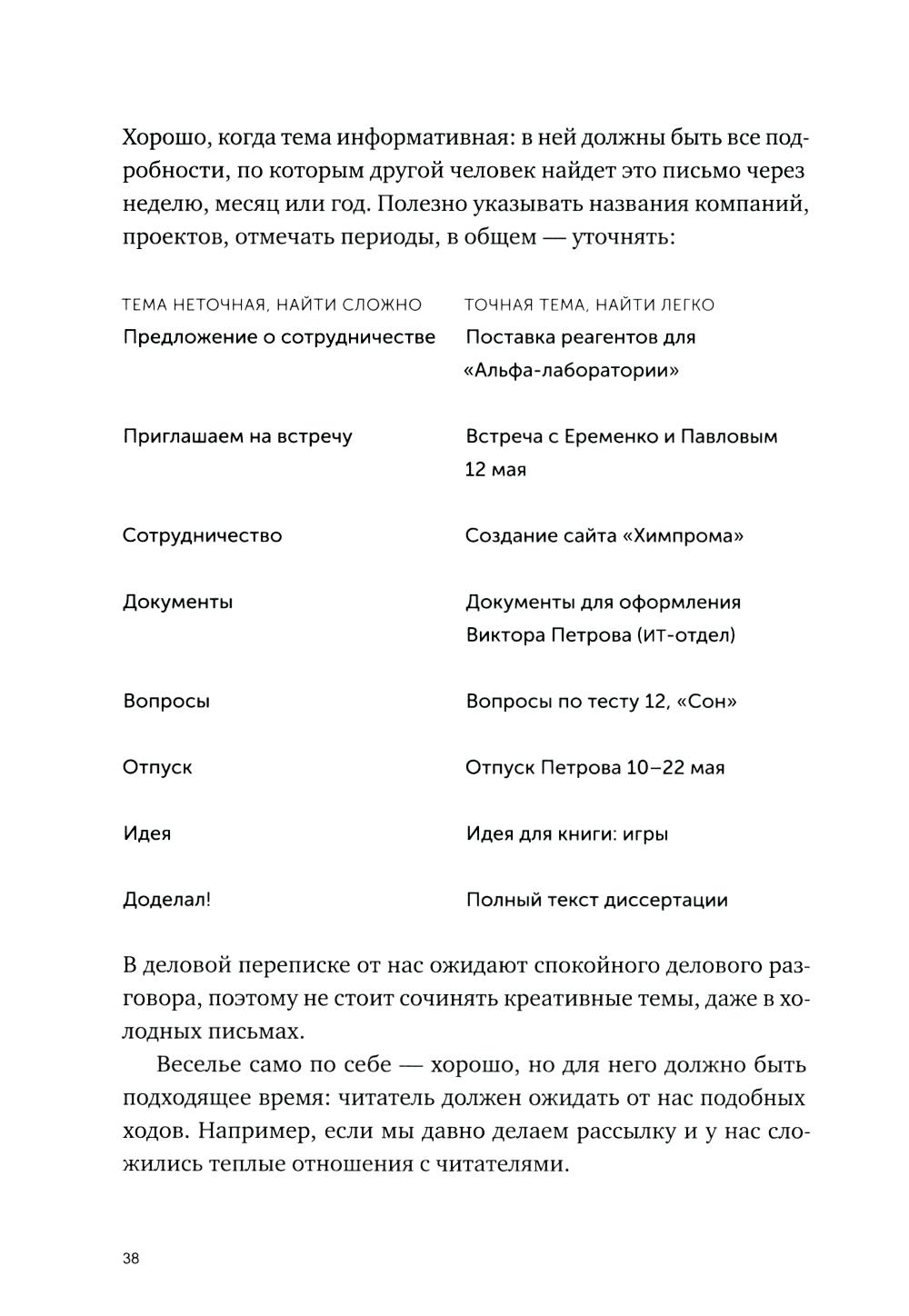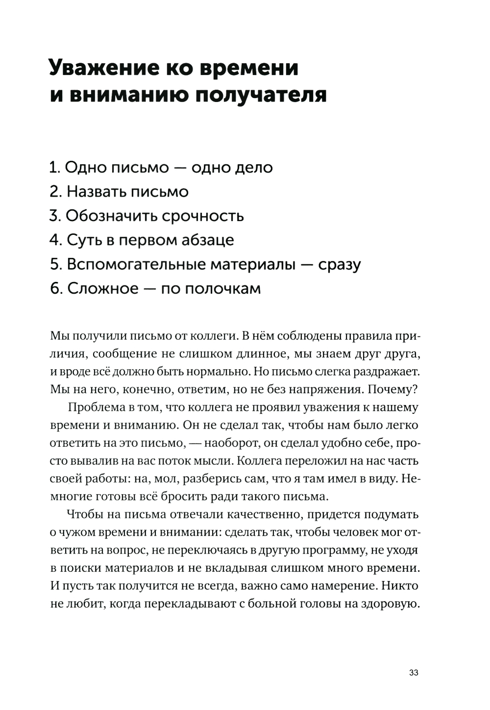 Последние двадцать лет нас учили, что деловая переписка - это бесконечные реверансы, бессмысленные формы вежливости и вымученные шаблоны: «Коллеги, я вас услышал», «Клиент прислал правочки, внесите АСАП. Заранее спасибо», «С уважением к вам и вашему бизнесу». Современное деловое письмо - это махровая фальшь, копеечные манипуляции и плохо скрываемое обоюдное презрение. Максим Ильяхов и Людмила Сарычева, авторы культовой книги «Пиши, сокращай», предлагают менять культуру делового письма и выдвигают два новых правила: уважение к адресату и забота о его интересах. Письма, составленные по таким правилам, располагают к вам людей и помогают находить общий язык. Следуя рекомендациям из книги, вы научитесь писать коммерческие предложения, сопроводительные письма, просьбы коллегам, ответы клиентам и любые другие рабочие письма.| Издательство | Альпина Паблишер |