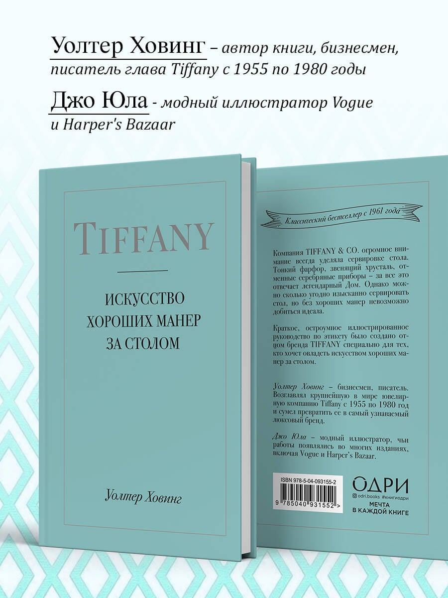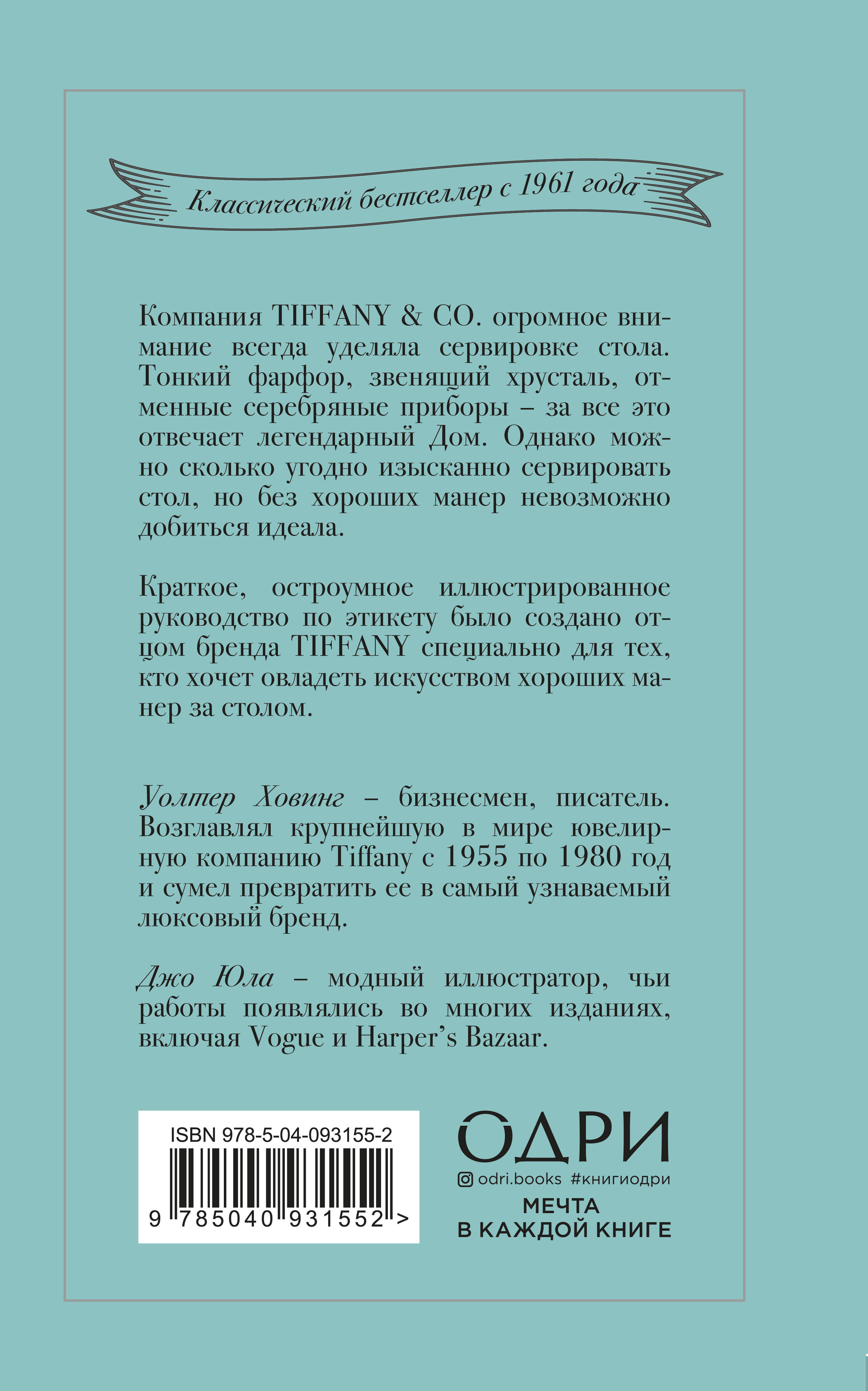 Краткое, остроумное иллюстрированное руководство по этикету было создано отцом бренда TIFFANY специально для тех, кто хочет овладеть искусством хороших манер за столом. Компания Tiffany & Co. огромное внимание всегда уделяла сервировке стола. Тонкий фарфор, звенящий хрусталь, отменные серебряные приборы - за все это отвечает легендарный Дом. Однако можно сколько угодно изысканно сервировать стол, но без хороших манер невозможно добиться идеала. Из этой книги вы узнаете: - куда правильно класть салфетку, - как не испачкать одежду во время приема пищи, - чем нож для рыбы отличается от ножа для мяса, - в какой ситуации нельзя вытирать рот, - какие существуют виды сервировки столов, - как дать знать официанту, что вы закончили есть, - какие блюда можно есть руками, - что делать, если вы пролили воду на платье соседки, - как поступить, если вам необходимо высморкаться, - какие есть тонкости в использовании чаши для рук. Уолтер Ховинг - бизнесмен, писатель. Возглавлял крупнейшую в мире ювелирную компанию Tiffany с 1955 по 1980 годы и сумел превратить ее в самый узнаваемый люксовый бренд. Джо Юла - модный иллюстратор, чьи работы появлялись во многих изданиях, включая Vogue и Harper's Bazaar.| Издательство | ООО "Издательство "Эксмо" |